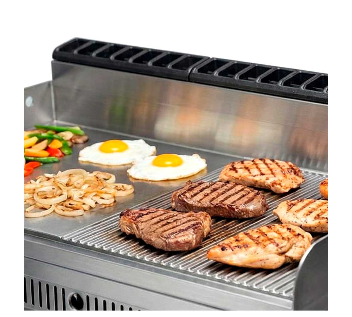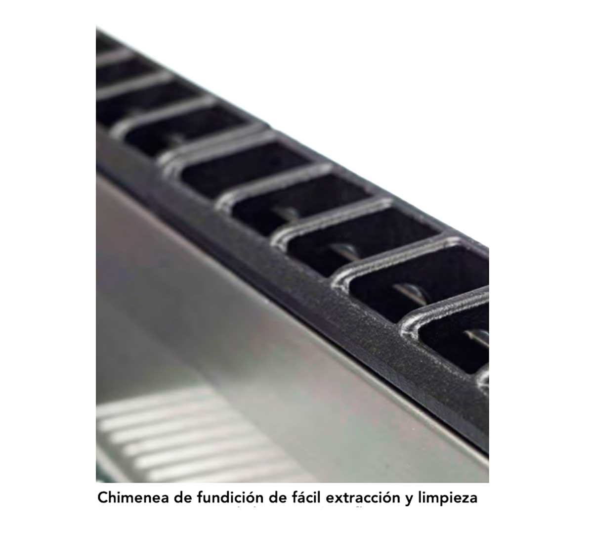 Plancha fry-top a gas con con termopar de seguridad y llama piloto. La placa es mixta, está fabricada en acero rectificado y tiene un espesor de 20 mm. La chimenea es de fácil extracción y limpieza. Incluye 2 espátulas.