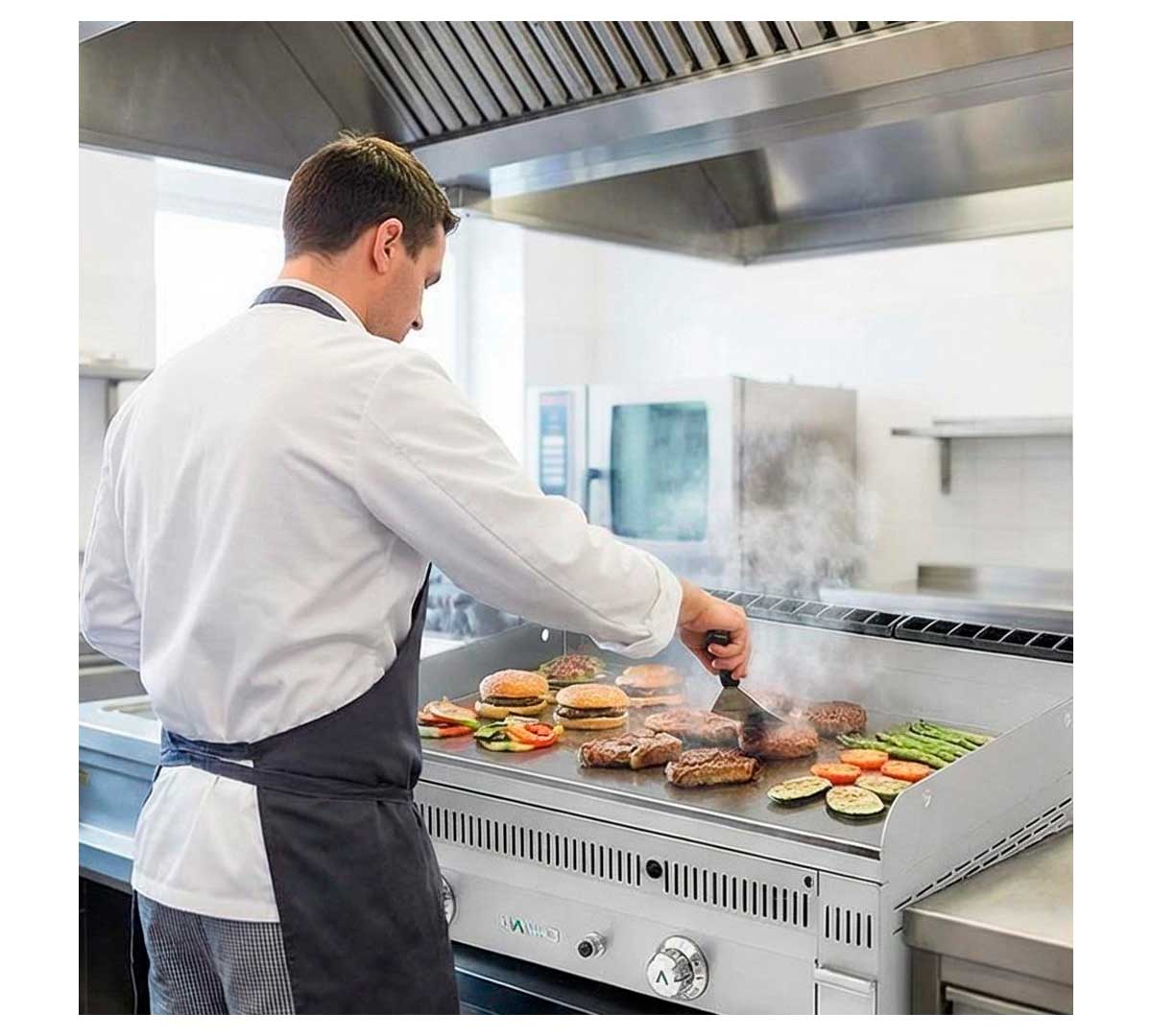 Plancha fry-top a gas con con termopar de seguridad y llama piloto. La placa es lisa, está fabricada en acero rectificado y tiene un espesor de 20 mm. La chimenea es de fácil extracción y limpieza. El encendido es por tren de chispas a batería. Incluye 1 espátula.
