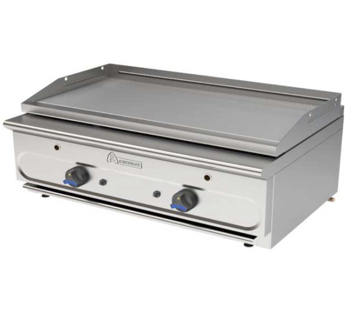 Este equipo, también conocido como plancha de asar a gas, destaca por su placa de acero rectificada con baño de cromo duro de 60 micras, que garantiza una excelente transmisión del calor y una limpieza sencilla, además de minimizar la adherencia de los alimentos y facilitar el mantenimiento diario.