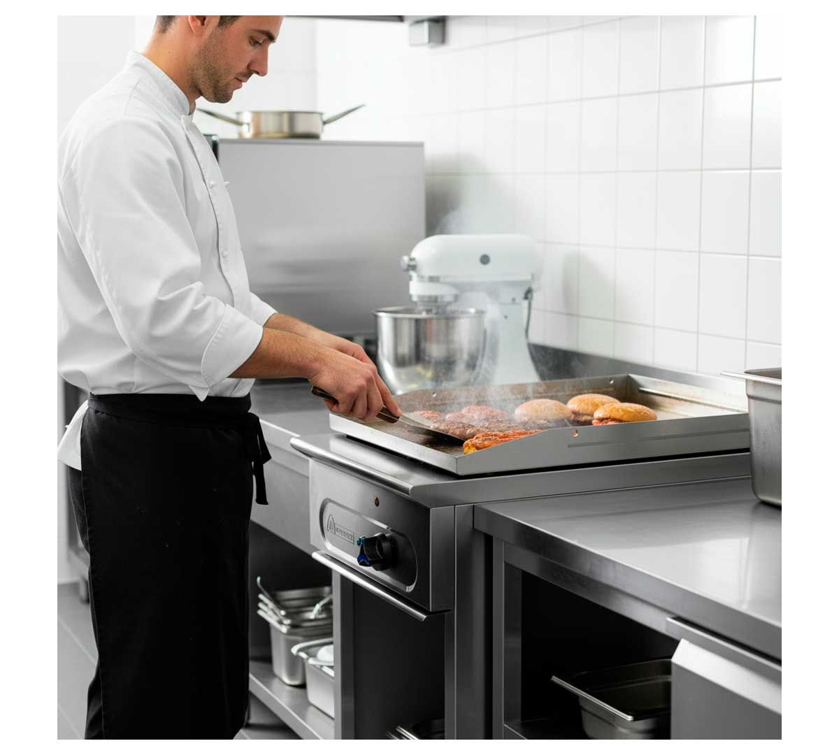 Este fry-top es perfecto para la preparación de carnes, pescados, verduras, huevos y una amplia variedad de alimentos que requieren una cocción directa y precisa. Su superficie amplia y su potencia lo convierten en una opción ideal para cocinas que necesitan agilidad y resultados homogéneos en cada servicio.