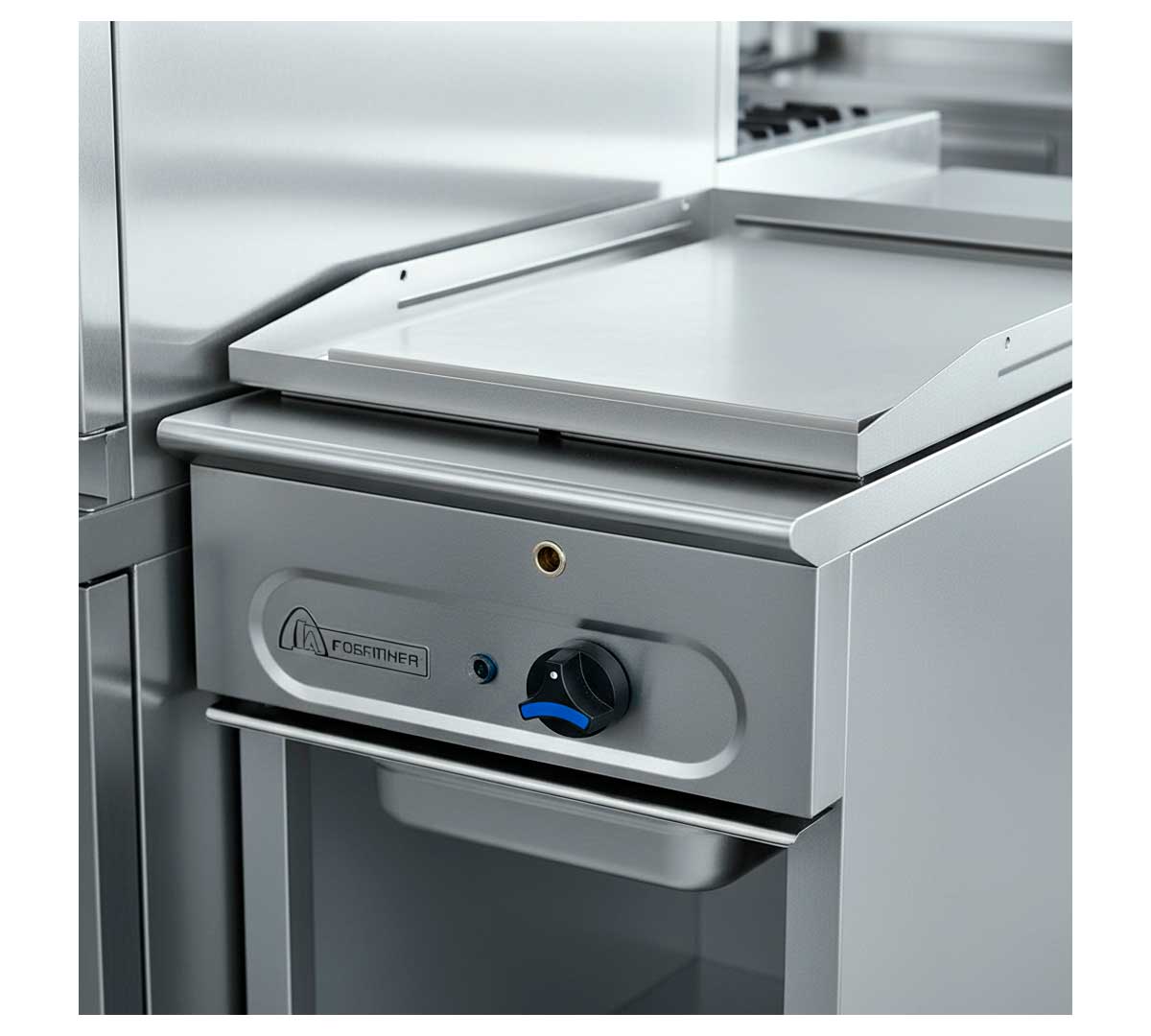 Está diseñado para ofrecer una cocción uniforme y profesional en cualquier cocina exigente. Su diseño en acero inoxidable y su placa lisa rectificada de gran espesor garantizan durabilidad, facilidad de limpieza y una excelente transferencia térmica, permitiendo trabajar con grandes volúmenes de alimentos de manera constante y precisa.