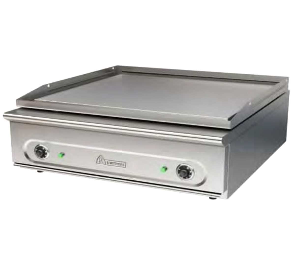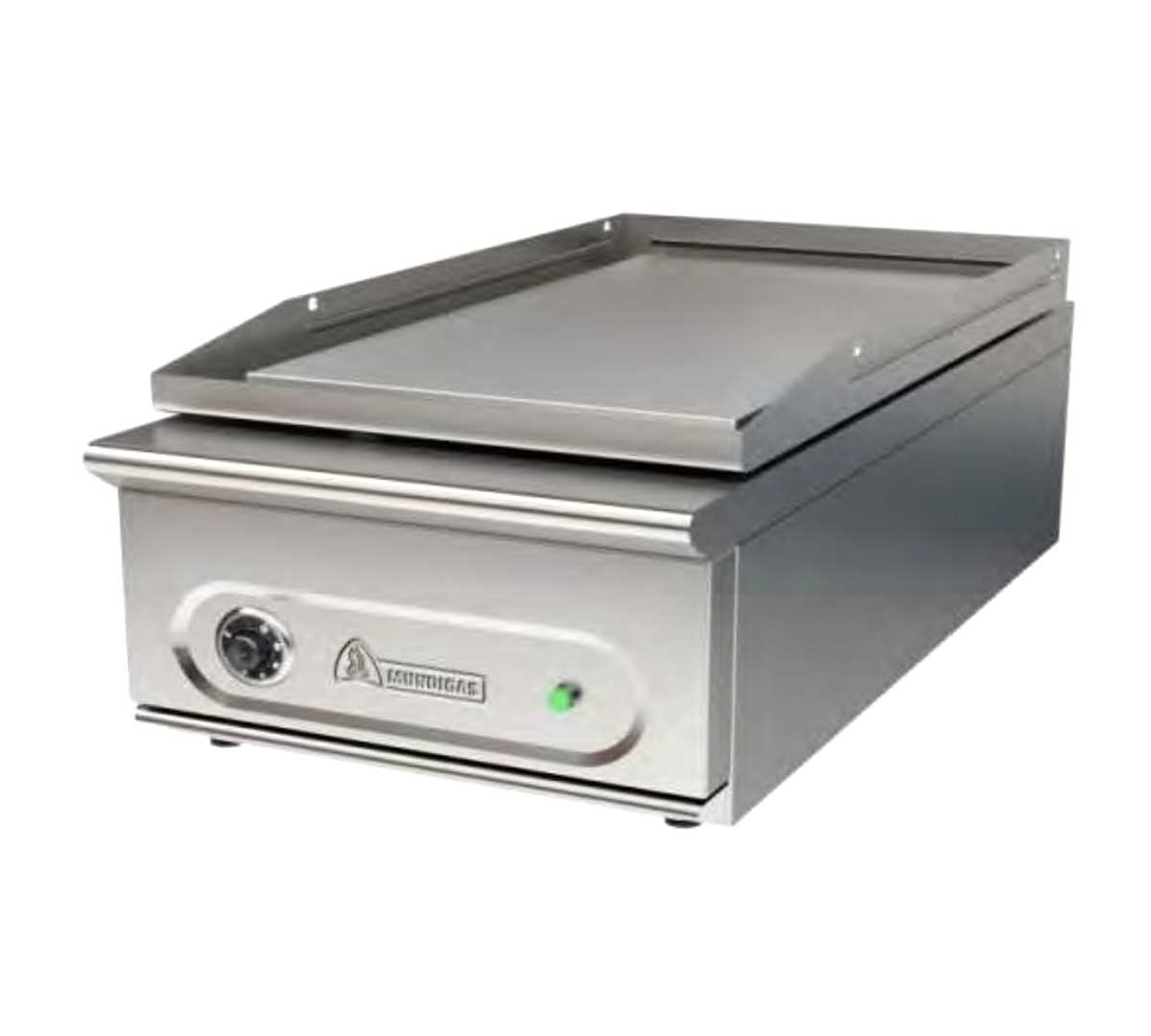 Fry top eléctrico con placa lisa de cromo duro de alta resistencia, superficie amplia y bandeja recoge grasas. Acabado en acero inoxidable, encendido piezoeléctrico y patas regulables en altura.