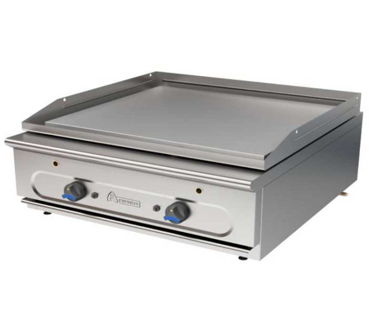 Fry top a gas con placa lisa de cromo duro de 60 micras, gran superficie útil y alta potencia, ideal para un cocinado uniforme y eficiente en cualquier cocina profesional.