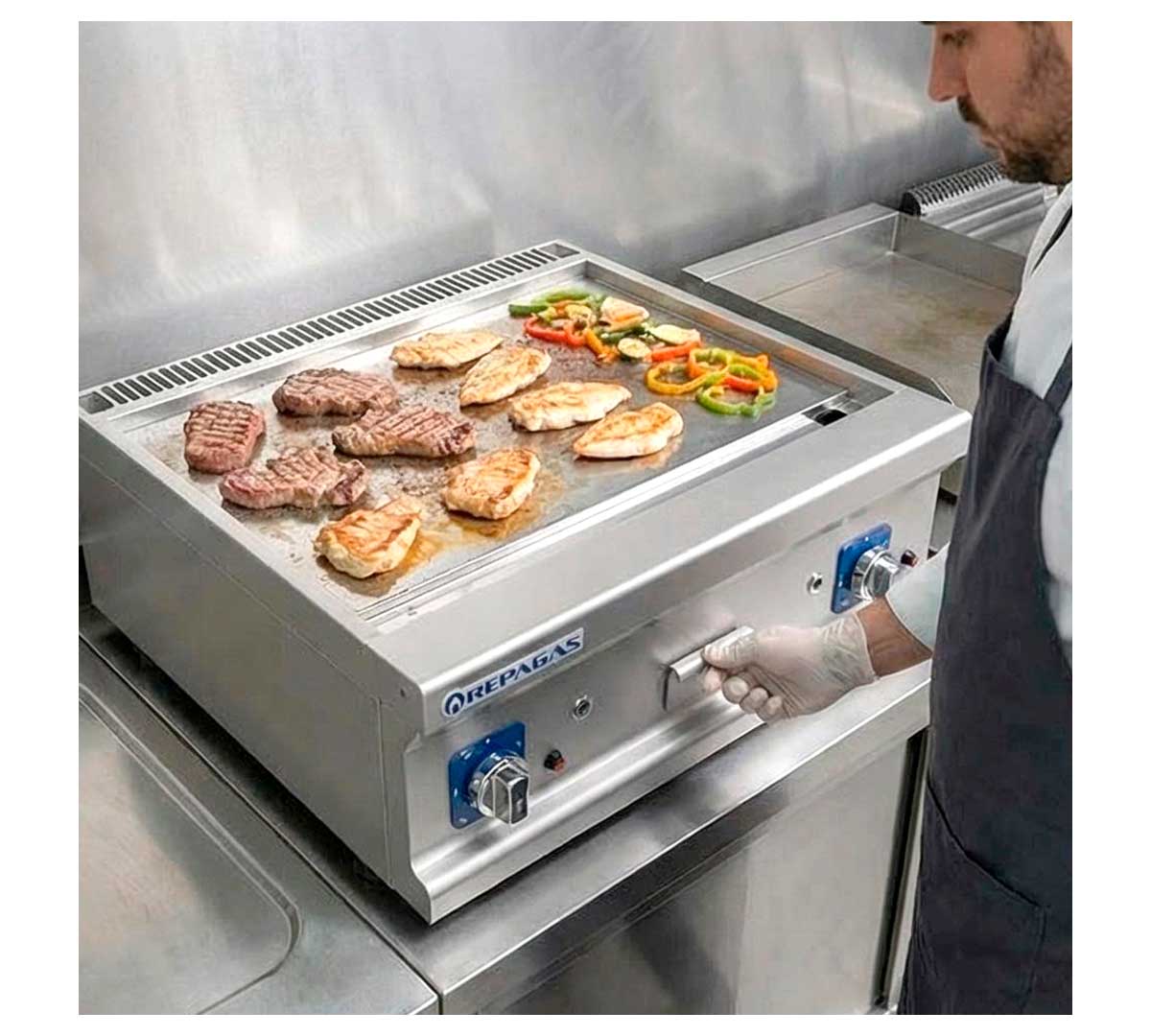 Este fry-top es perfecto para la preparación de todo tipo de carnes, pescados y verduras, permitiendo un control preciso del punto de cocción y una presentación impecable. Es especialmente indicado para cocinas que requieren rapidez, limpieza y resultados homogéneos en la plancha, como restaurantes, braserías, bares y colectividades.