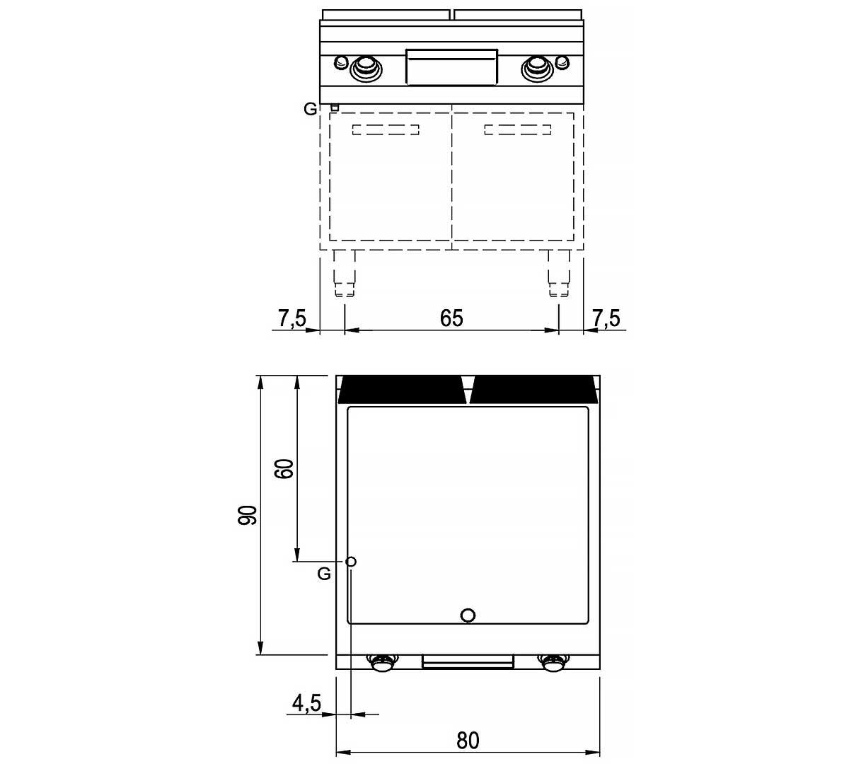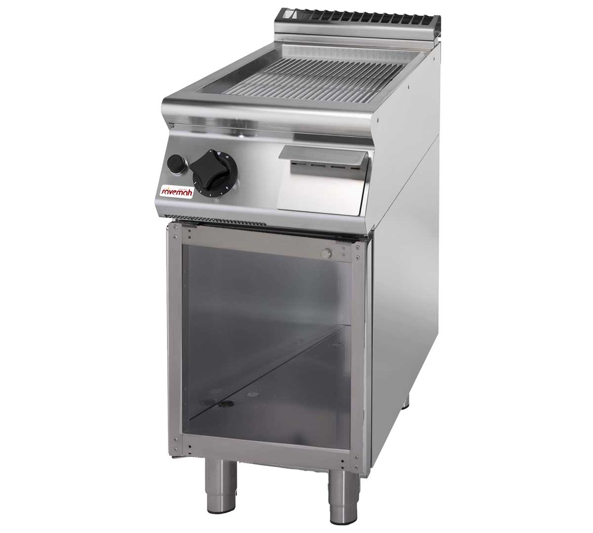 Placa ranurada de acero, robusta. Con gran superficie de cocción y recogida de grasas eficiente. Encimera en acero inoxidable. De fácil limpieza y alta potencia para servicio intensivo en cocinas profesionales.