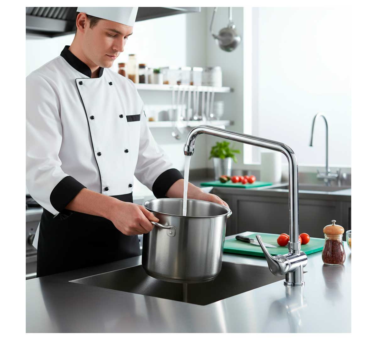 Grifo con caño diseñado para el llenado de ollas. Tiene un ángulo casi de 90 grados que facilita la entrada de los utensilios. Fabricado en latón cromado de alta calidad y diseñado para uso intensivo.