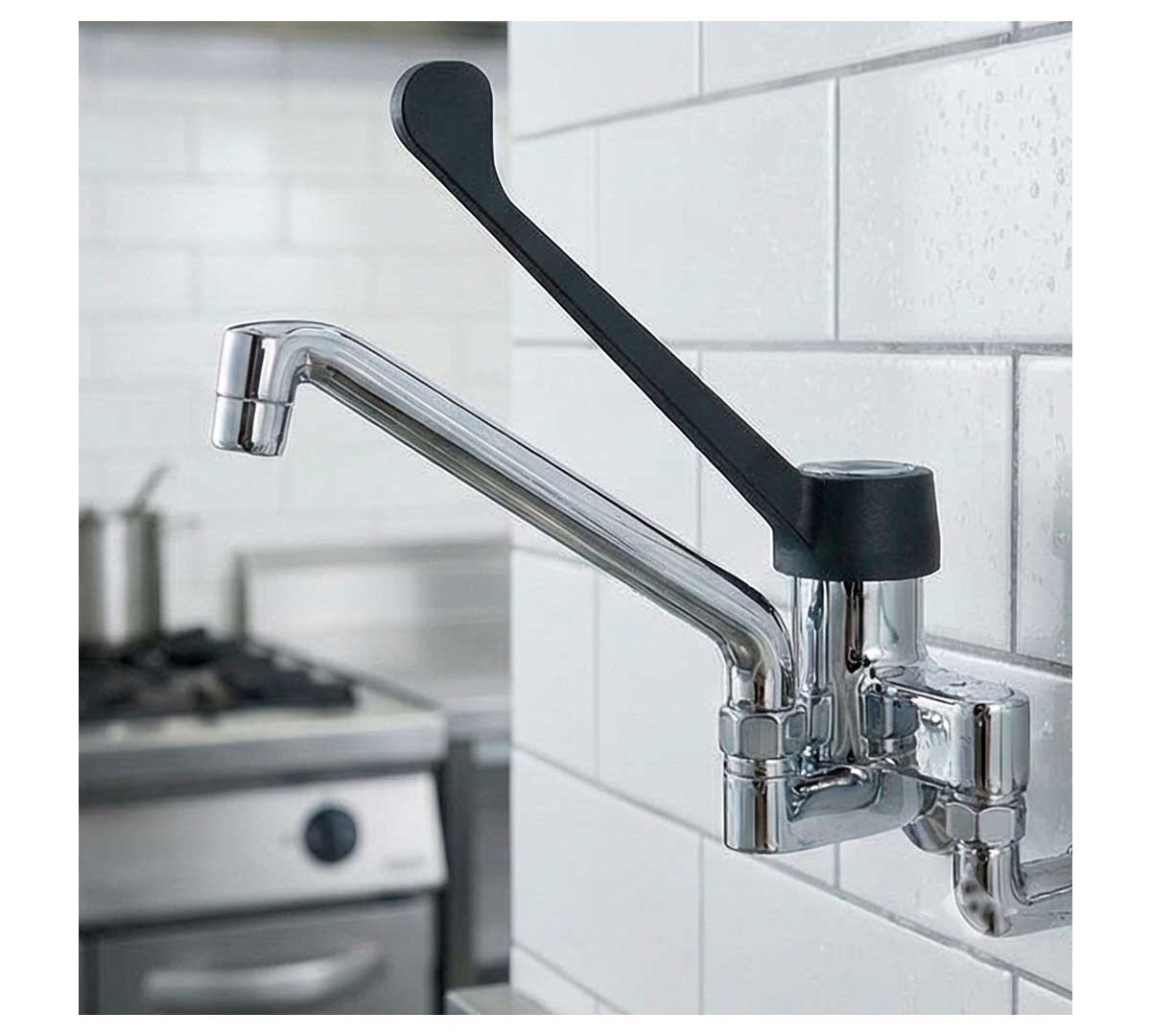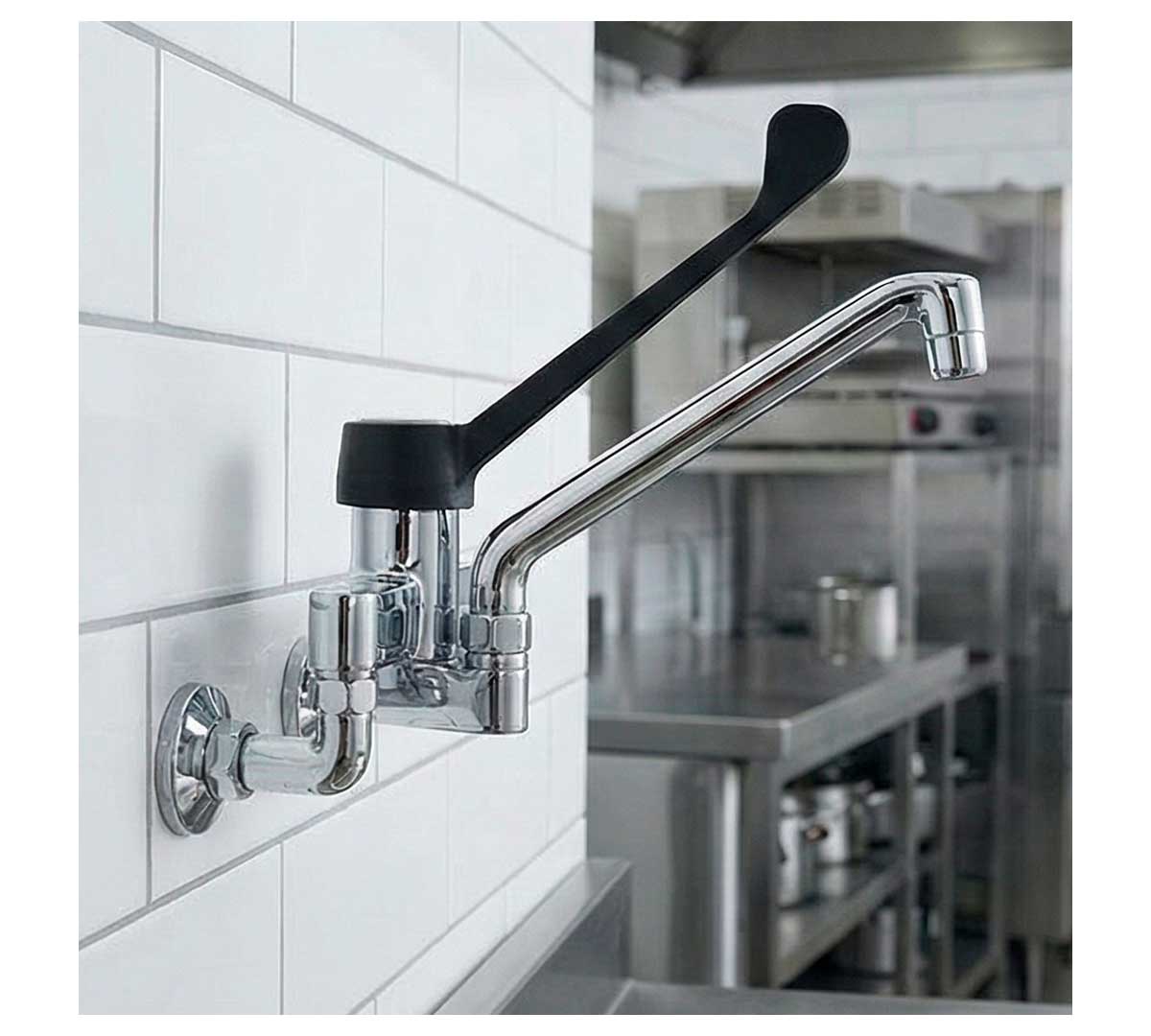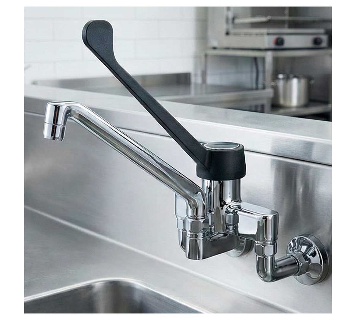 Grifo industrial mezclador para instalación en la pared. Diseñado para un uso intensivo y continuo para las cocinas más exigentes. Dispone de una maneta larga que se puede activar con el movimiento del codo, de gran ayuda en la cocina cuando se tienen las manos ocupadas.