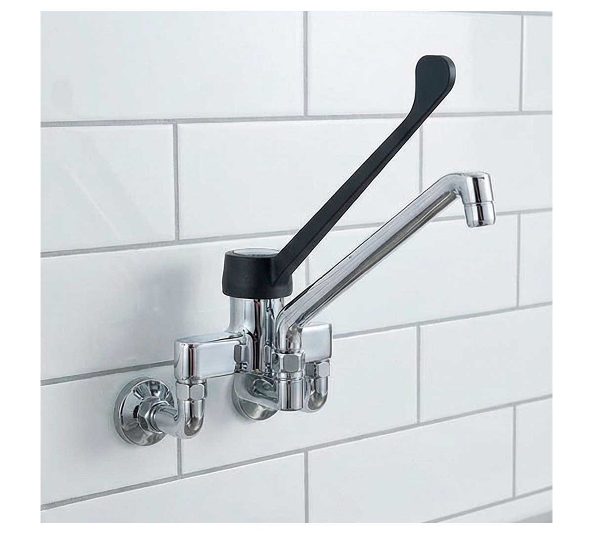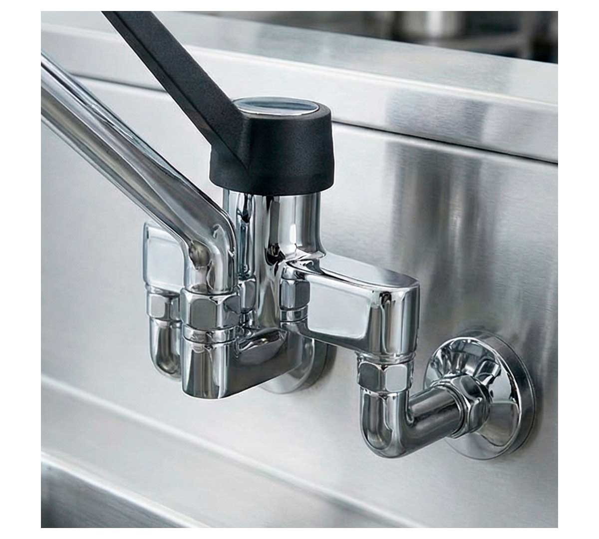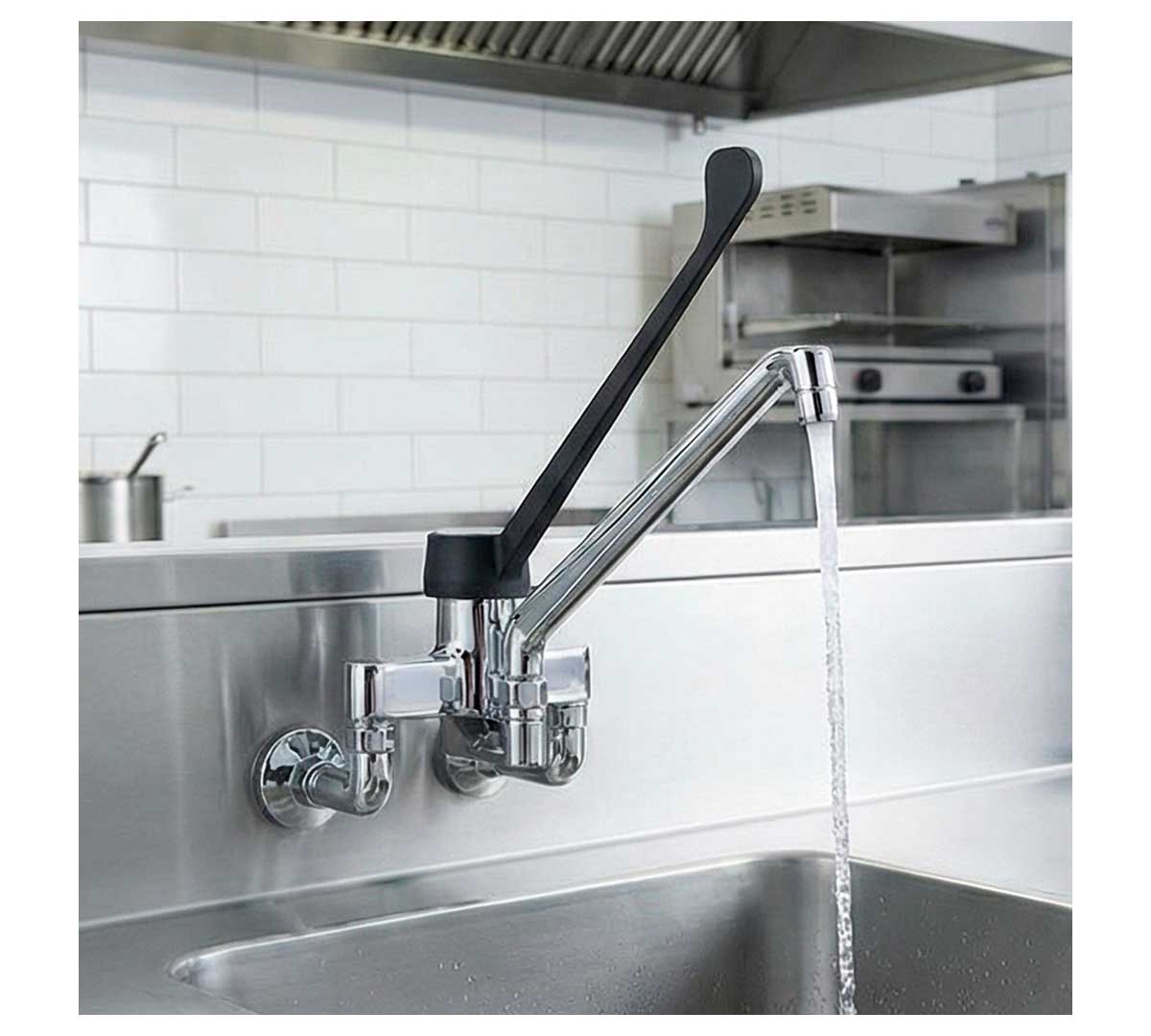 Grifo industrial mezclador para instalación en la pared. Diseñado para un uso intensivo y continuo para las cocinas más exigentes. Dispone de una maneta larga que se puede activar con el movimiento del codo, de gran ayuda en la cocina cuando se tienen las manos ocupadas.