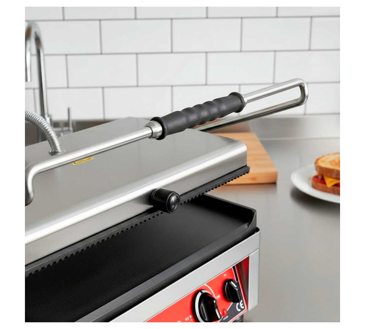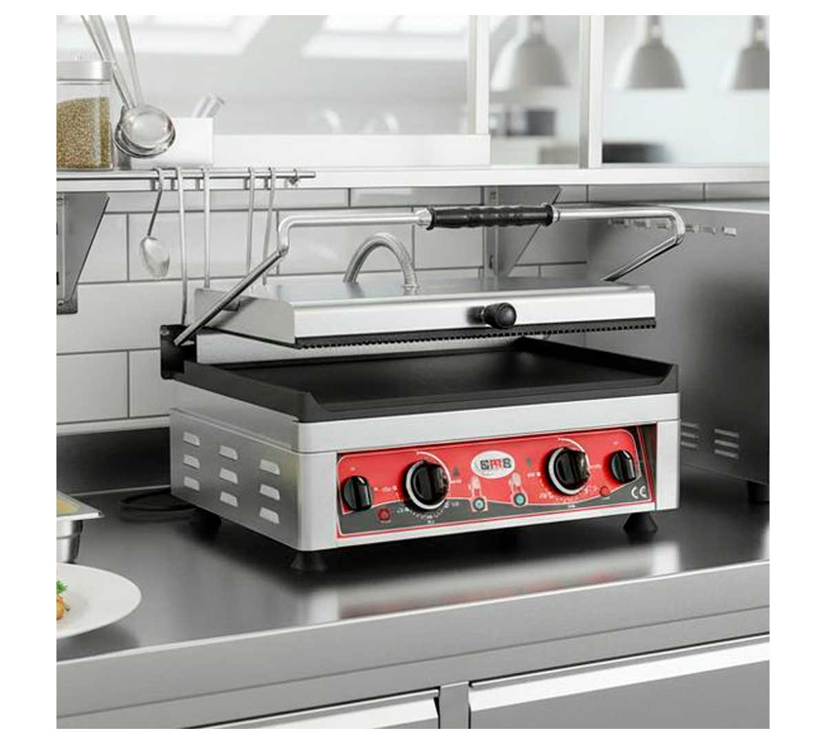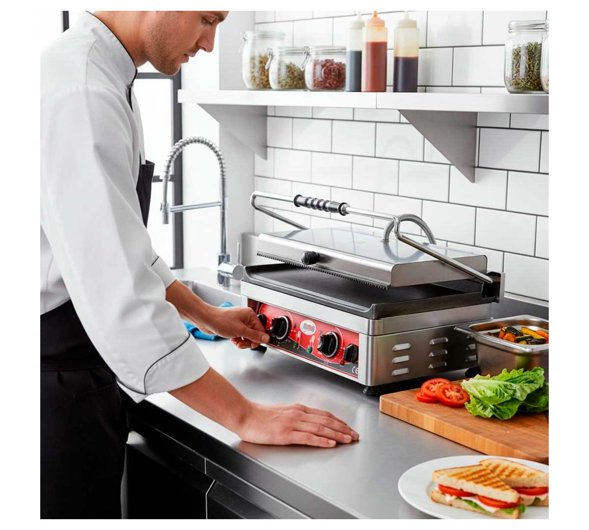 Grill eléctrico con 1 zona de cocción lisa y prensa superior acanalada. Tiene dos mandos que permiten regular de forma independiente la plancha la plancha inferior y superior. Diseñada especialmente para bocadillos, sándwich, carne y vegetales.