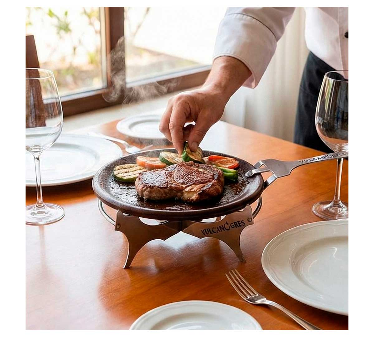 El Conjunto de Carne a la Piedra de Vulcano Gres incluye soporte, pinzas y un plato refractario.