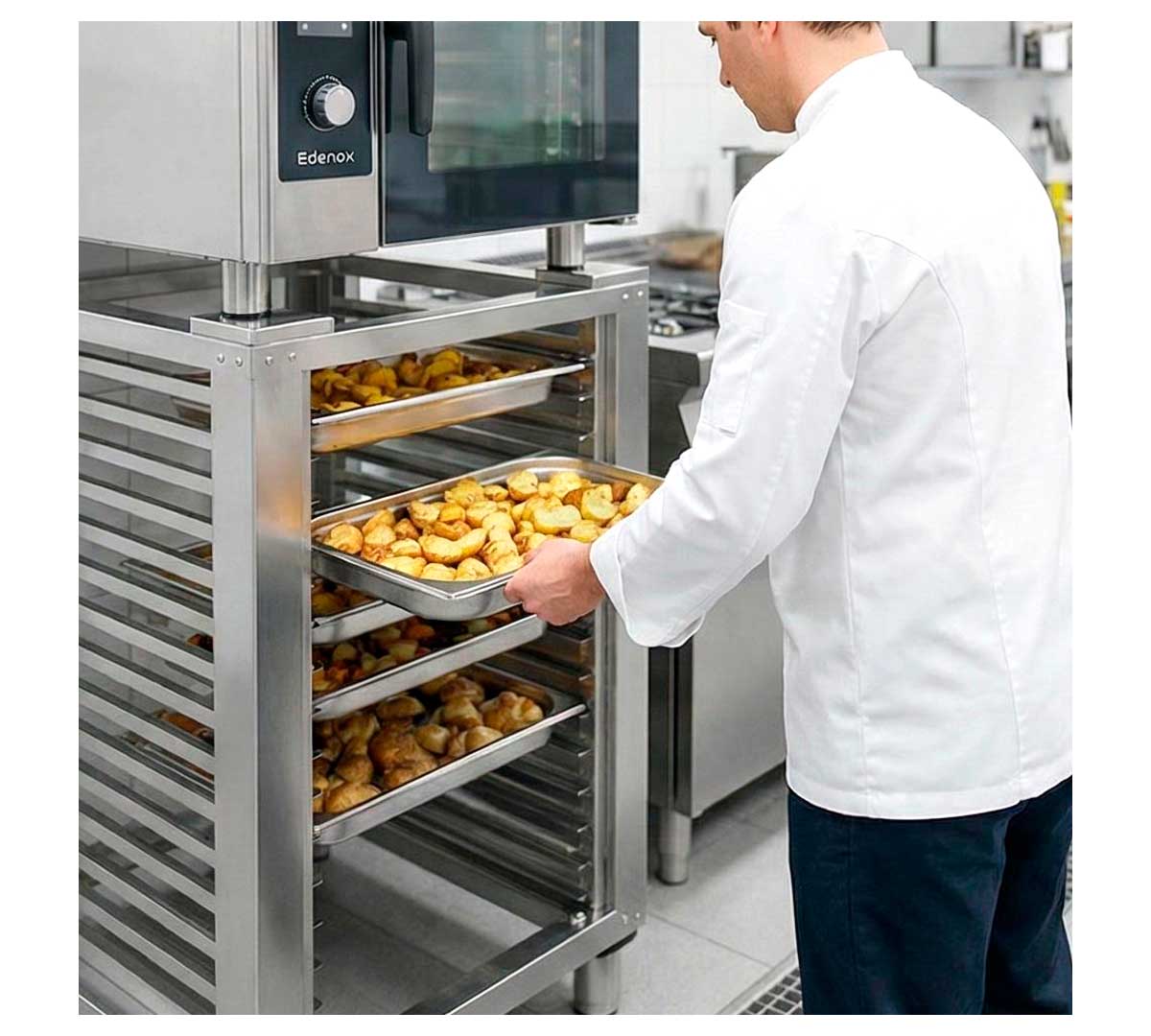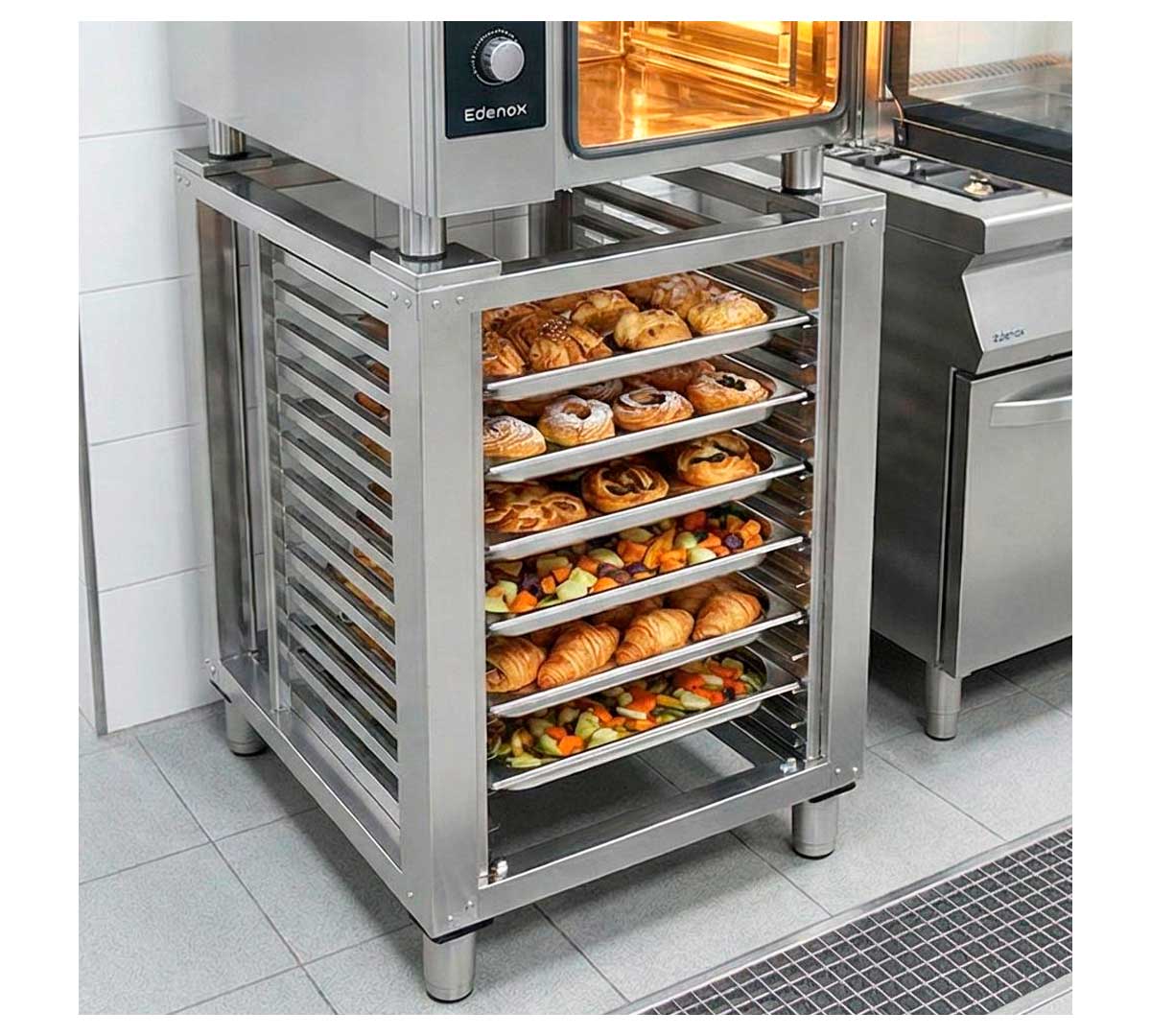 Soporte con 10 guías GN 1/1 fabricado en acero inox y diseñado para los hornos de la línea compact de Edenox. Compatible con los hornos mixtos HCC 611 y HCC 1011 de Edenox.