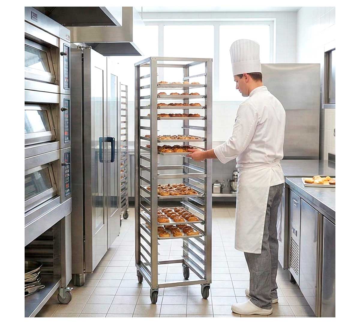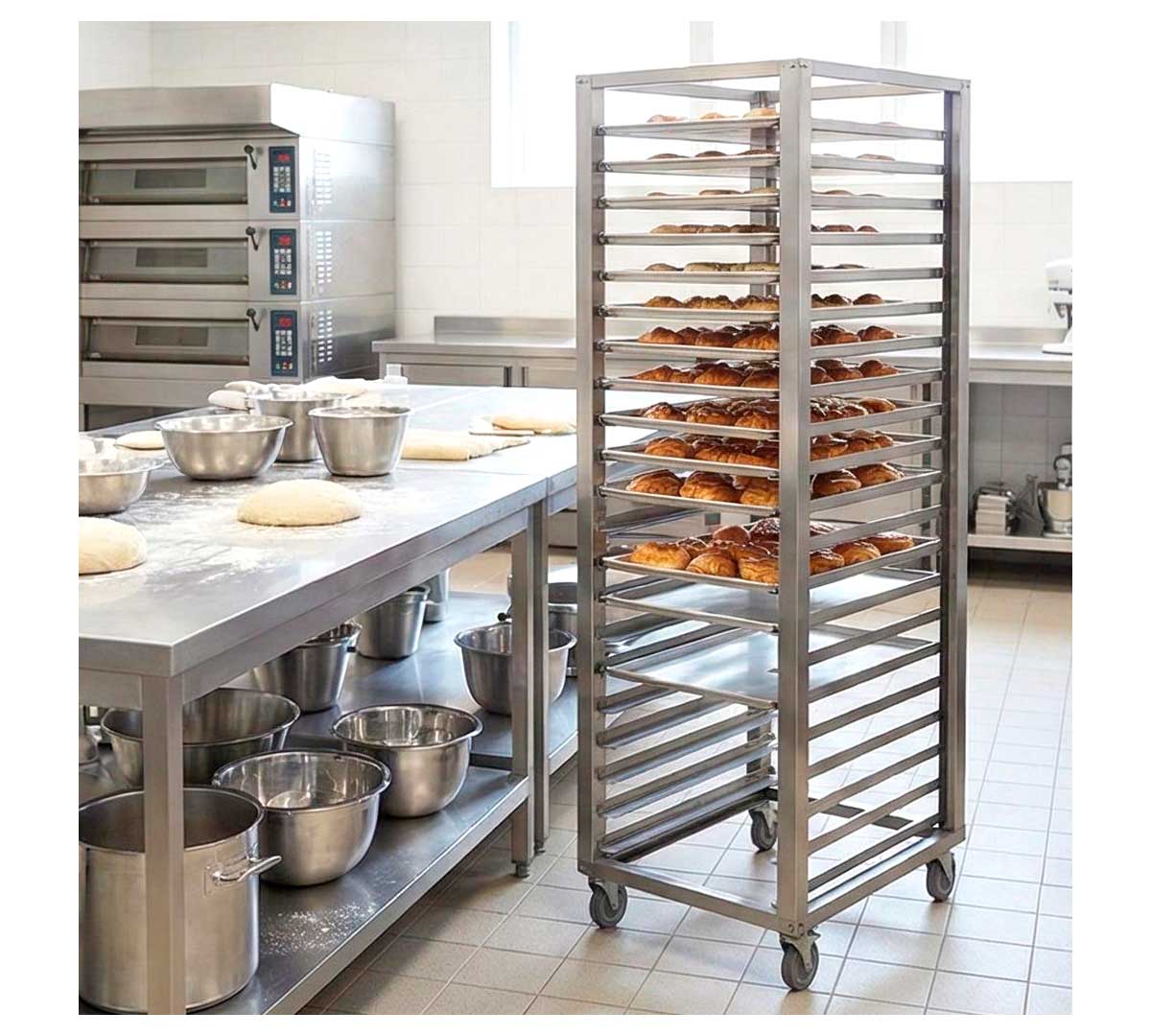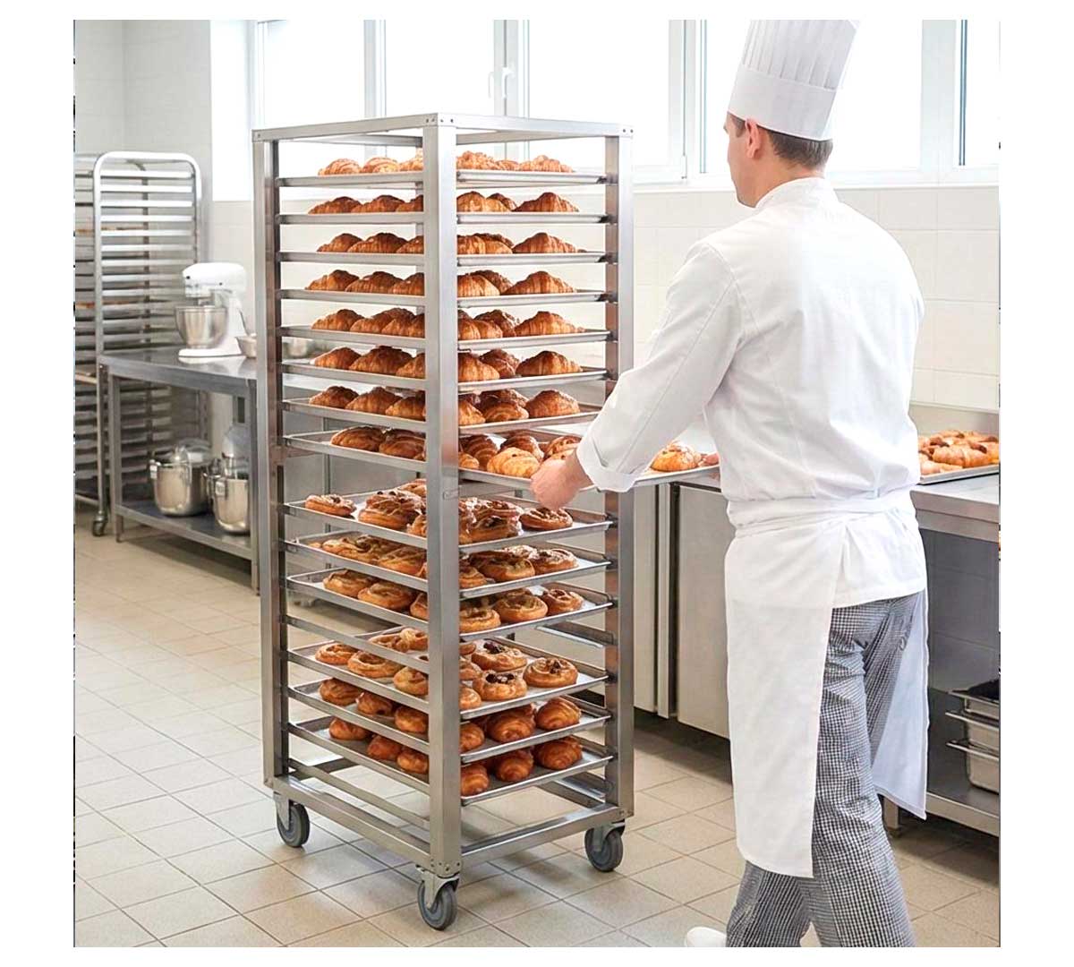 Este carro porta bandejas está diseñado con 20 niveles y tiene capacidad para bandejas de diferentes tamaños, según el modelo. Tiene 4 ruedas de 12,5 cm de diámetro que facilitan su traslado, dos de ellas con freno.