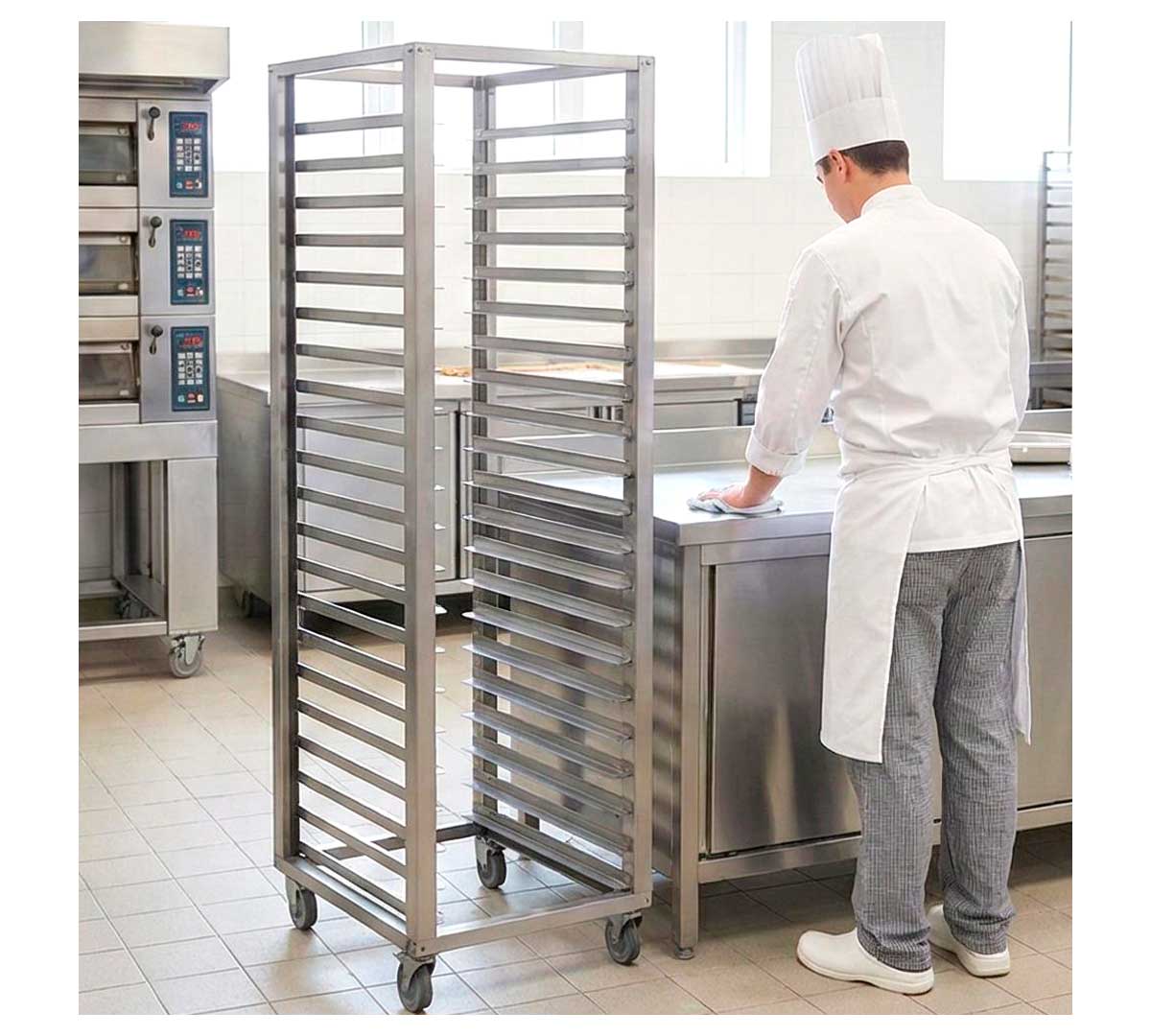 Carro porta bandejas fabricado en acero inoxidable disponible para bandejas de varios tamaños. Este carro dispone de 20 guías y 4 ruedas.
