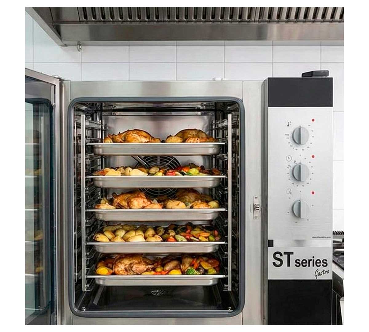 El Horno Mixto Gas STG Gastro 71 M de FM funciona con panel de control manual muy fácil de usar. Tiene una capacidad para 7 bandejas GN 1/1.