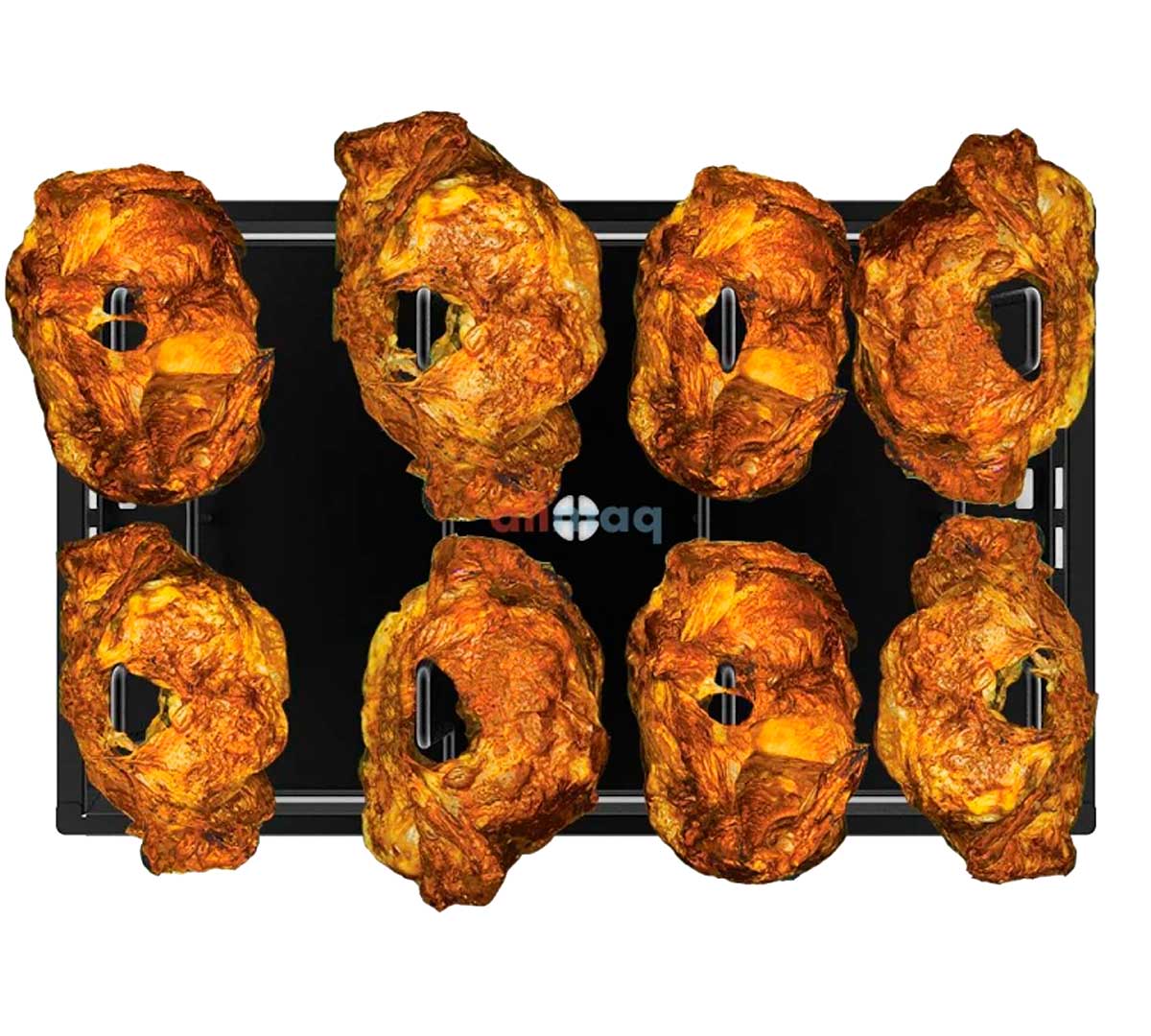 Parrilla profesional antiadherente fabricada en acero inoxidable. Para 8 pollos enteros. Está dotada de un sistema recoge grasas y descarga central. Tiene una altura de 16,7 cm. Es compatible con sistema de recogida de grasas Smart.Drain y con la rejilla de limpieza Pollo.Wash de Unox.