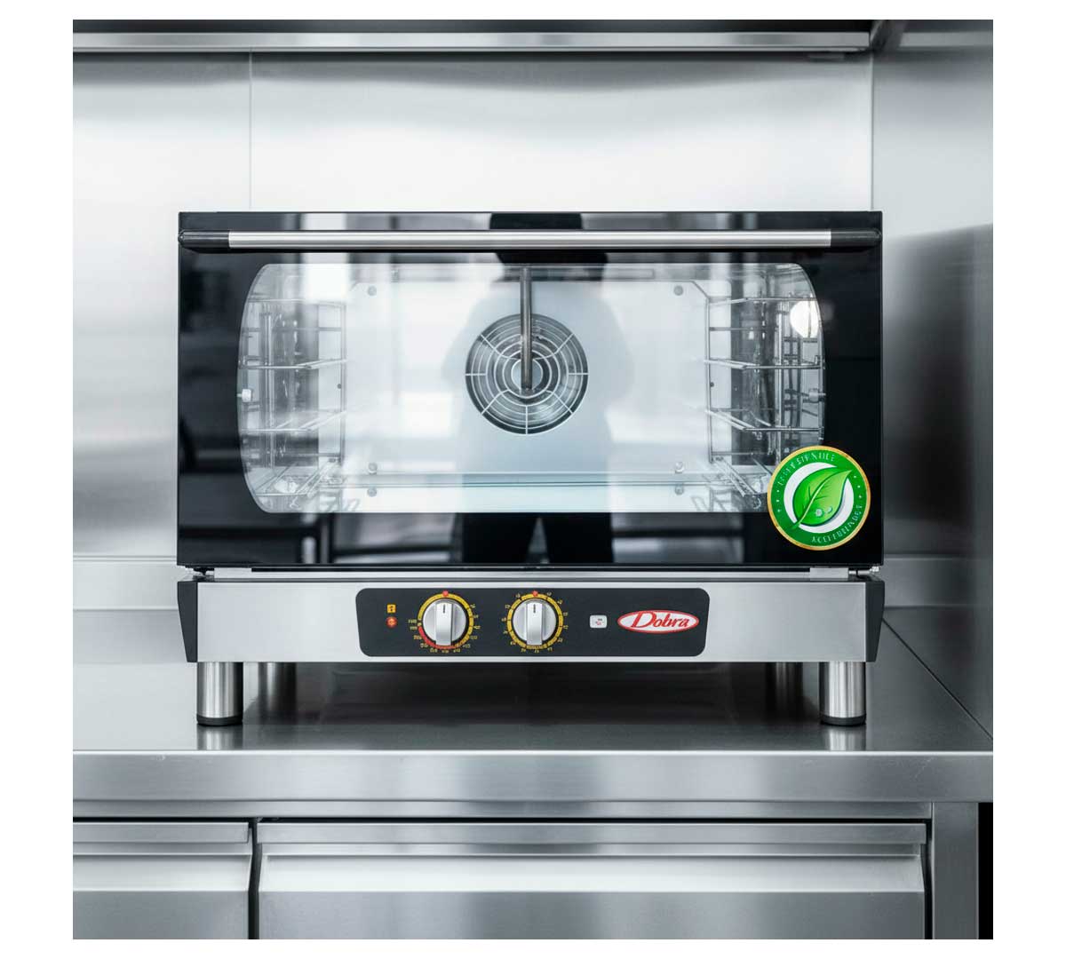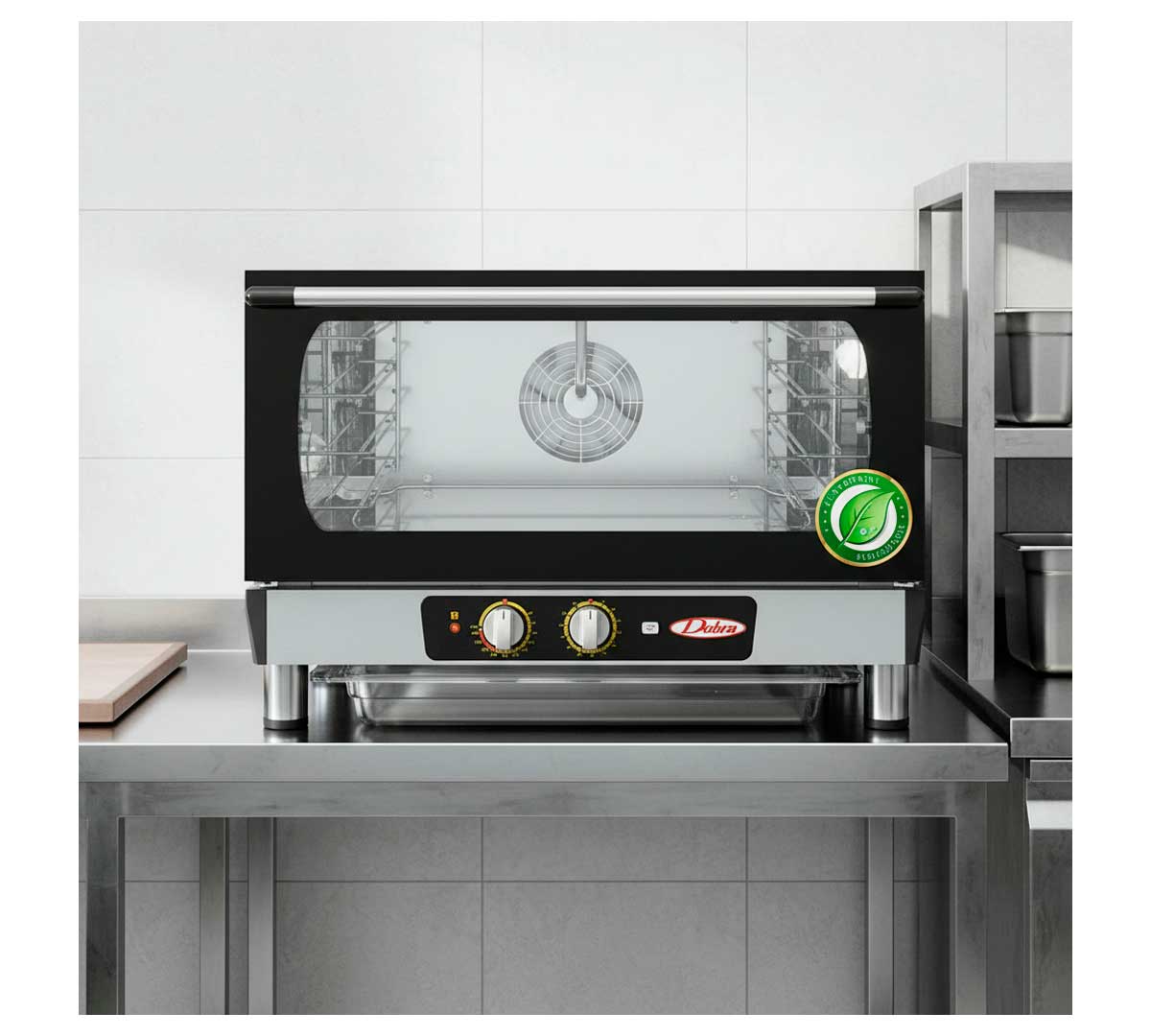 El Horno de Convección Zafiro Turbo Eco de Dobra con sistema ecológico garantiza la eliminación de humo, vapor u olor producido por el horno durante la cocción.