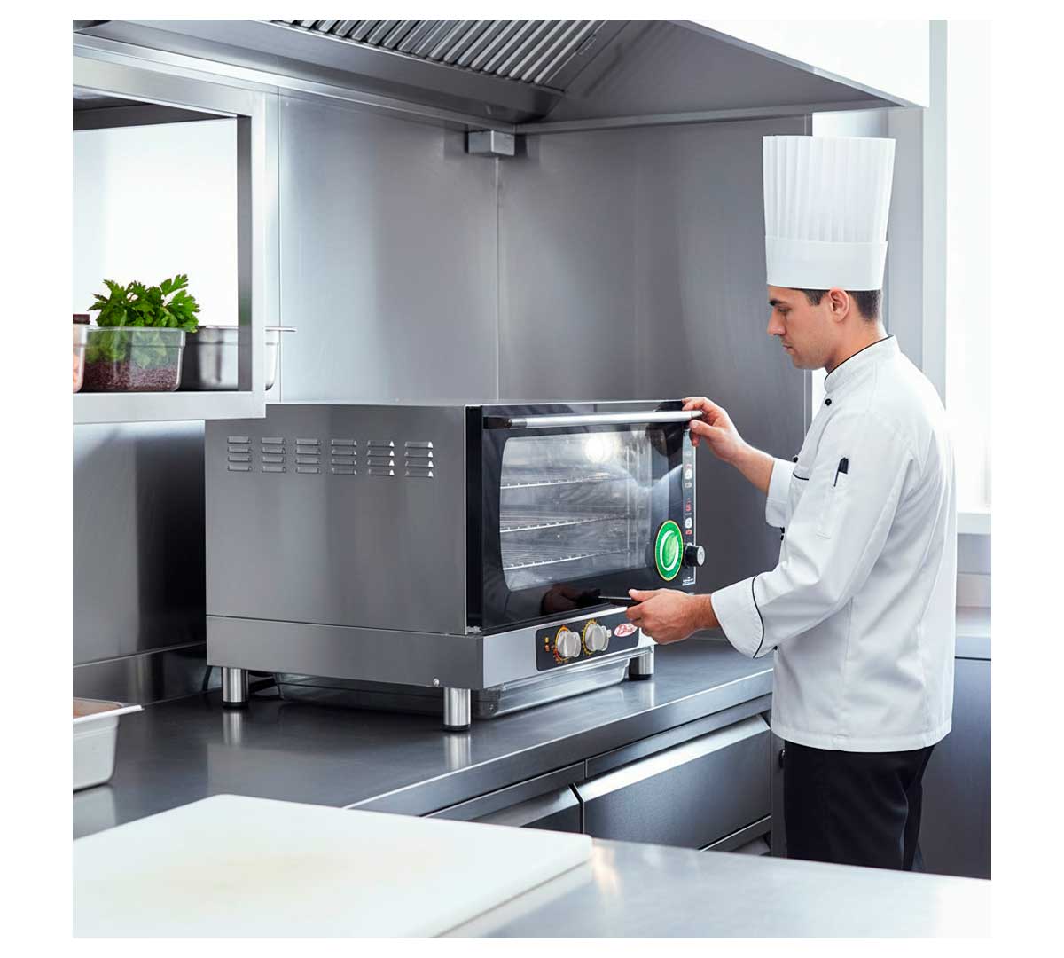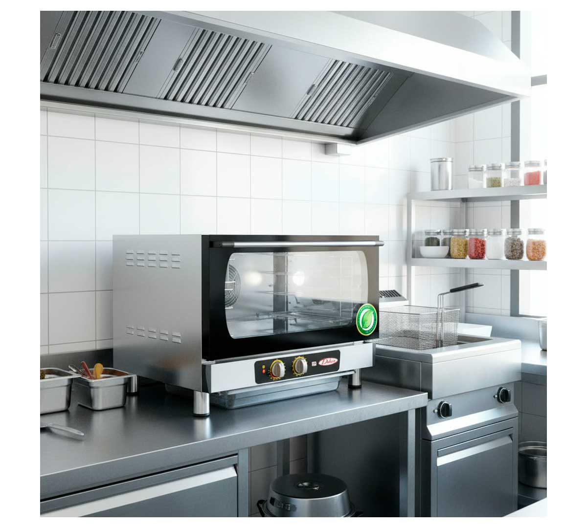 Horno eléctrico de convección con humidificador. Está equipado con condensador de humos integrado y bandeja extraible de vapores licuados. Tiene capacidad para 3 bandejas de 60 x 40 cm y unas dimensiones de 75 x 73 x 61 cm. Con una potencia de 3,2 kW y conexión monofásica