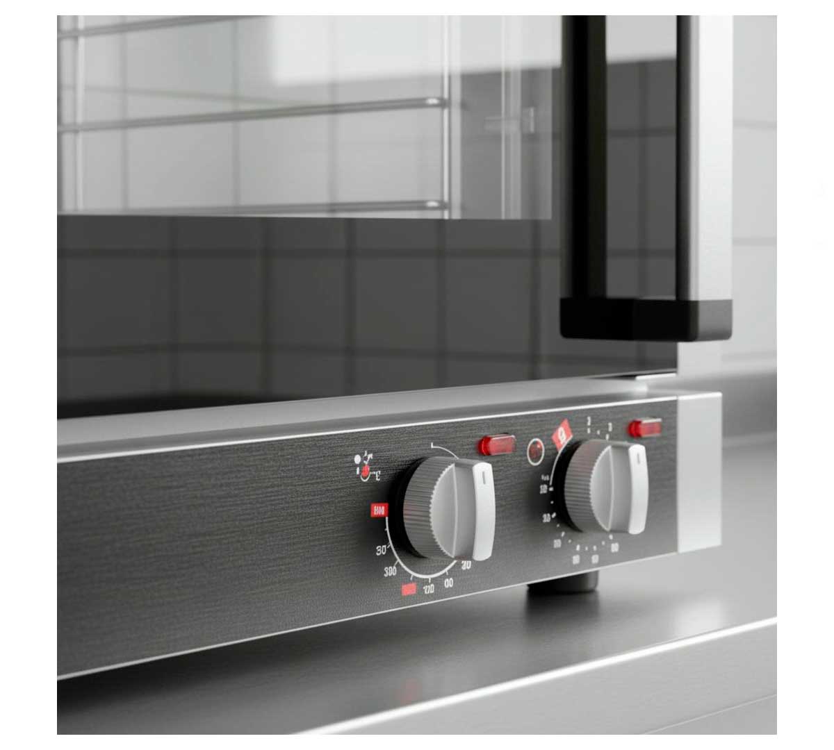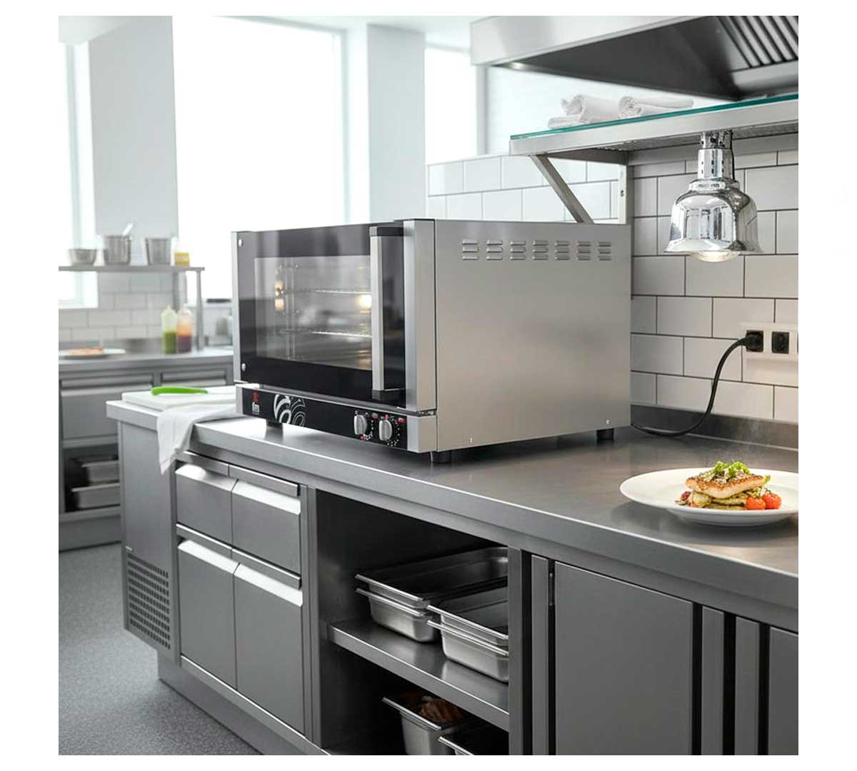 Este horno de convección viene equipado con 1 ventilador y puerta de apertura lateral, tiene capacidad para 3 bandejas 60 x 40 cm o GN 1/1. Tiene las siguientes dimensiones 82 x 80 x 48 cm y alcanza una temperatura máxima de 250 ºC. Tiene una potencia de 3,9 kW y su conexión es monofásica.