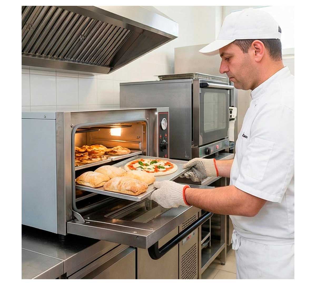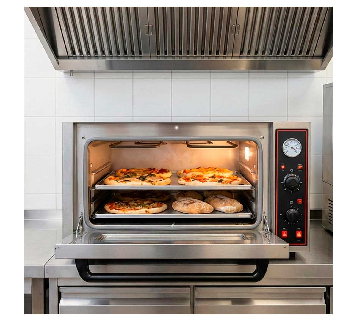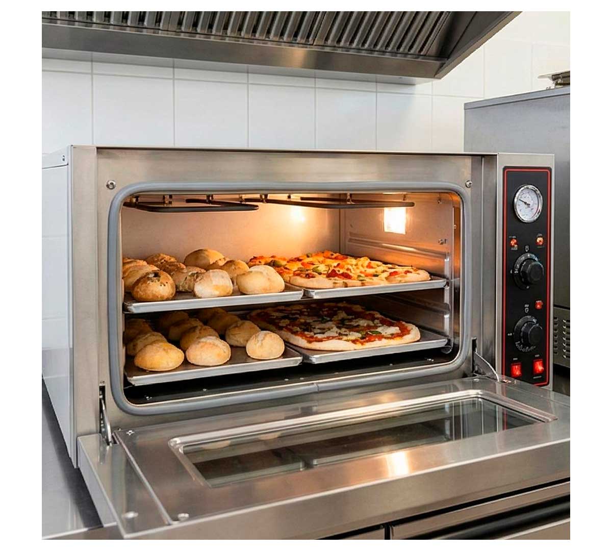 El Horno para Panadería y Pizza T2 de GGF es apto para la cocción de pan y pizza gracias a su altura interna de la cámara de 18 cm. Tiene capacidad para 2 bandejas con medidas 60 x 40 cm.
