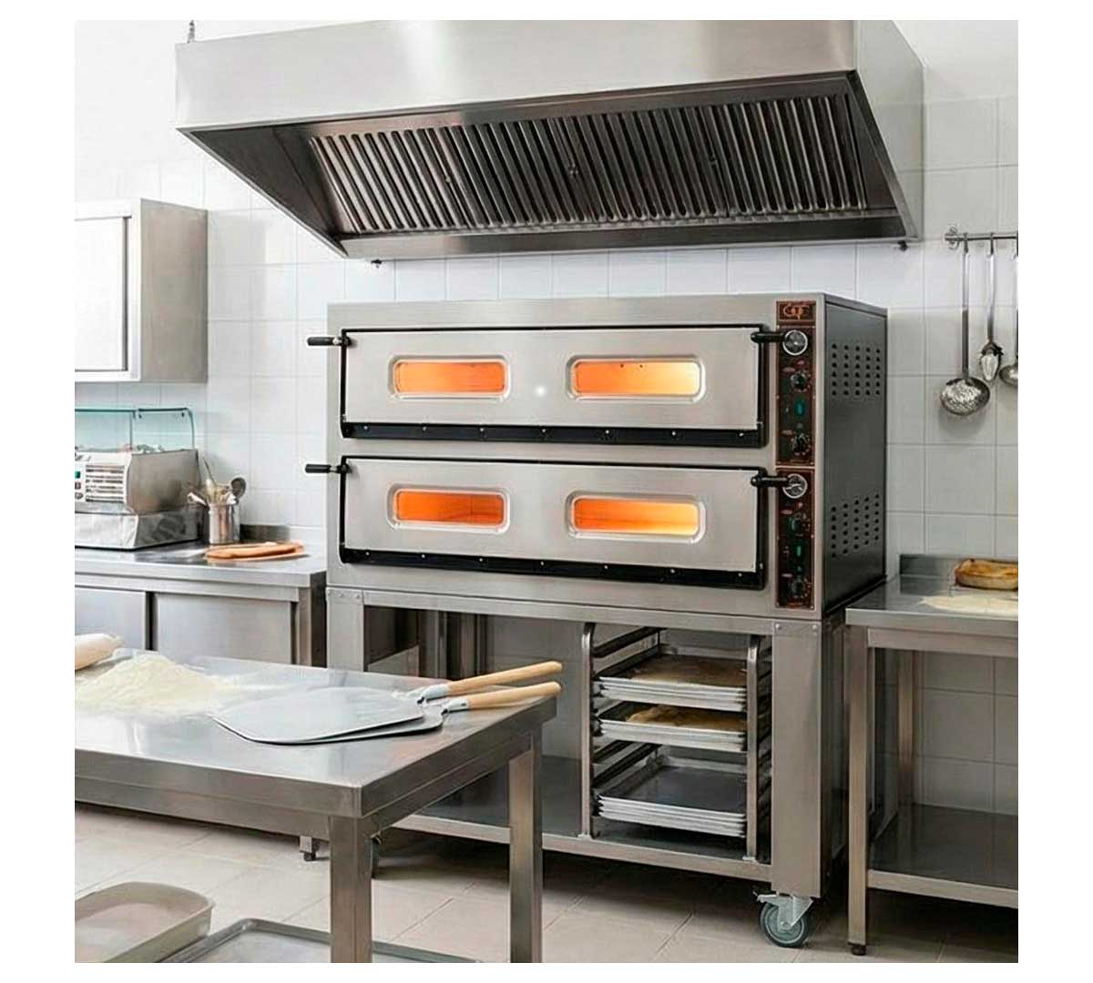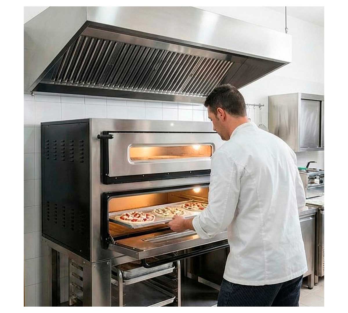 Horno apto para la cocción de pan y pizza gracias a la altura interna de las cámaras de 18 cm. Tiene 2 cámaras de cocción. El panel de mandos es electromecánico. Está equipado con termómetro y luz interior. Con capacidad para 6 bandejas con medidas 60 x 40 cm (no incluidas).