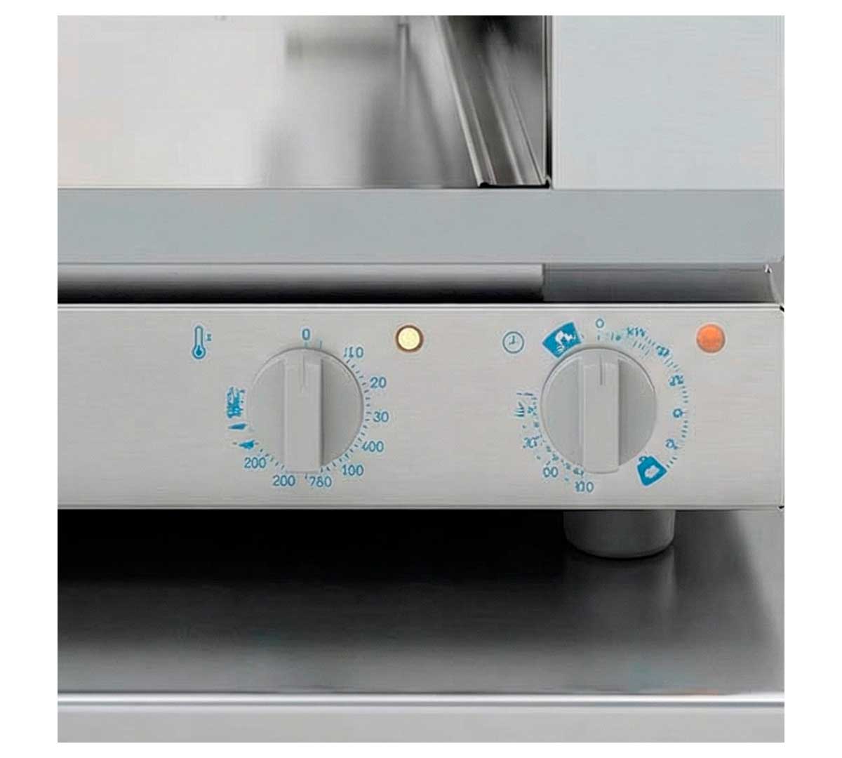 Este horno de convección tiene una capacidad para 3 bandejas 60 x 40 cm, puerta abatible y unas dimensiones de 76 x 80 x 46,5 cm. Además alcanza los 250 ºC. tiene una potencia de 3,9 kW y viene preparado para una conexión monofásica.