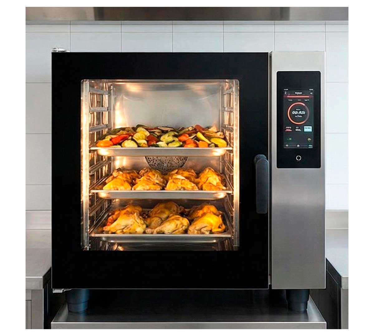 Horno mixto con pantalla táctil y sistema de autolimpieza incluido. Capacidad para 4 bandejas 60 x 40 cm, sus dimensiones son 76 x 80 x 75 cm y tiene 7,3 kW de potencia. De serie preparado para conexión trifásica y opcionalmente se puede cambiar a monofásica. Puerta lateral con apertura a mano derecha con cambio opcional a mano izquierda.