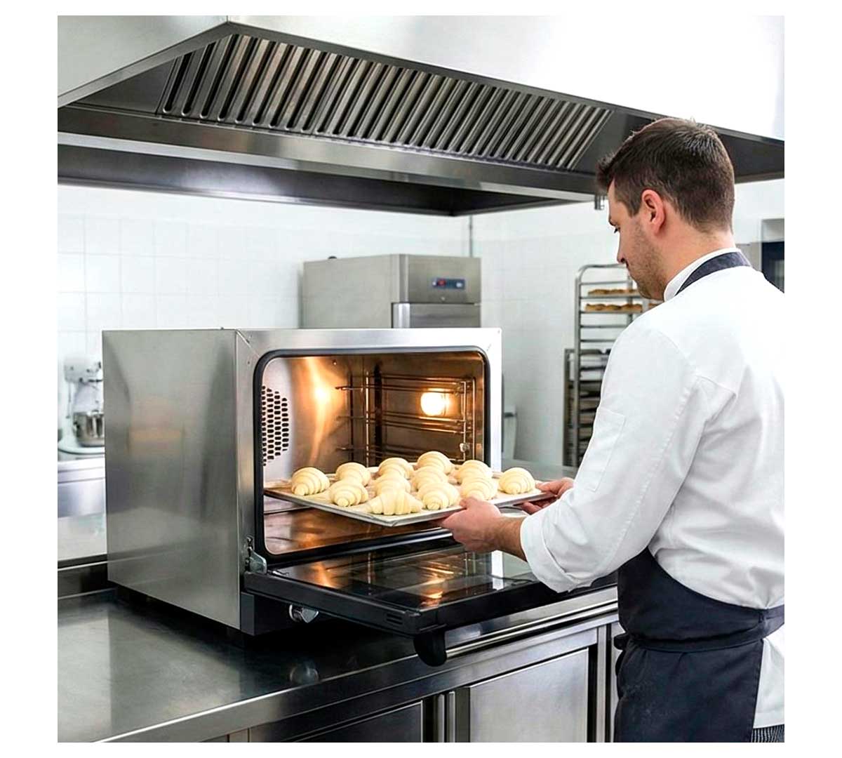 Horno eléctrico de convección de control manual. Está equipado con tecnología Air Plus para mejor distribución de aire en la cámara de cocción. Tiene capacidad para 3 o 4 bandejas de 43 x 33 cm. Está preparado para una conexión monofásica.