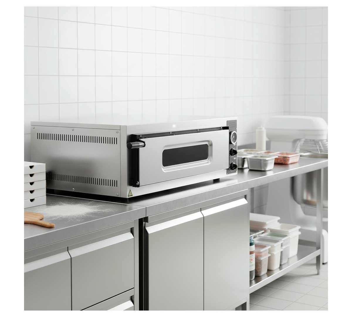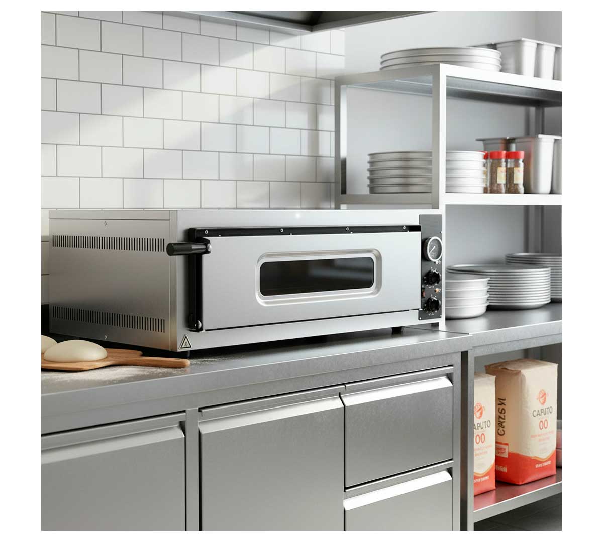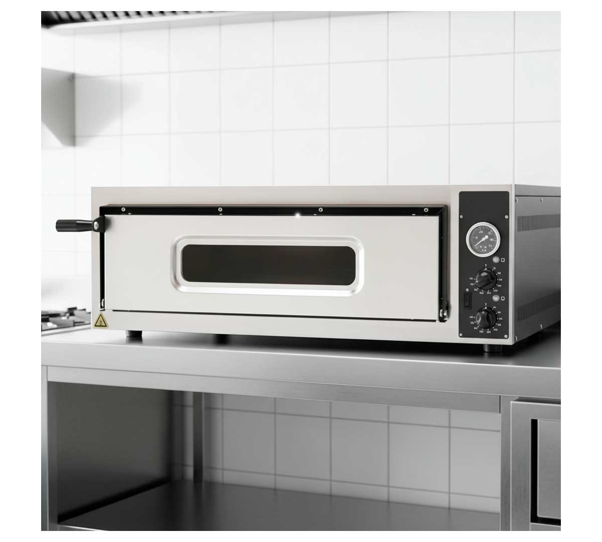 Horno de pizza eléctrico con una cámara de cocción con material refractario. Está equipado con termómetro y luz interior. El panel de mandos es electromecánico. Con aislamiento de lana de roca de alta densidad.