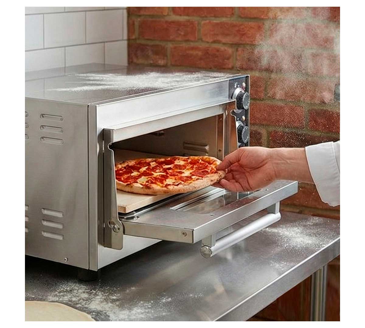 Horno eléctrico para pizzas con 1 cámara. La superficie de cocción es de material refractario de alta calidad. Equipado con temporizador 0-60 min y modo continuo. El control es manual.
