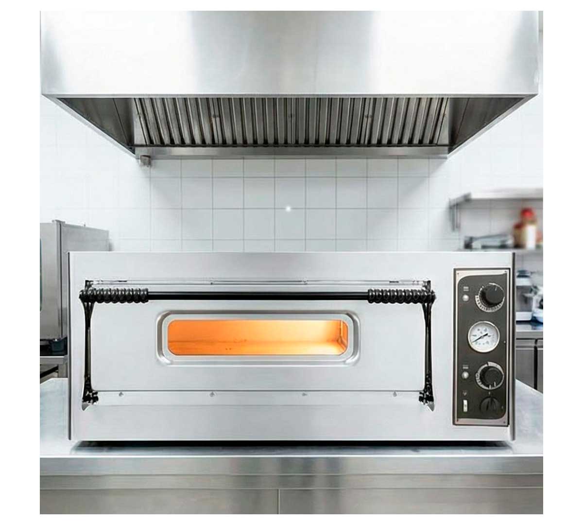 Horno eléctrico con 1 cámara de cocción. Tiene iluminación interna para poder controlar y hacer un seguimiento de la cocción de la pizza. La temperatura máxima es de 450 °C. El cuadro de mandos es analógico.