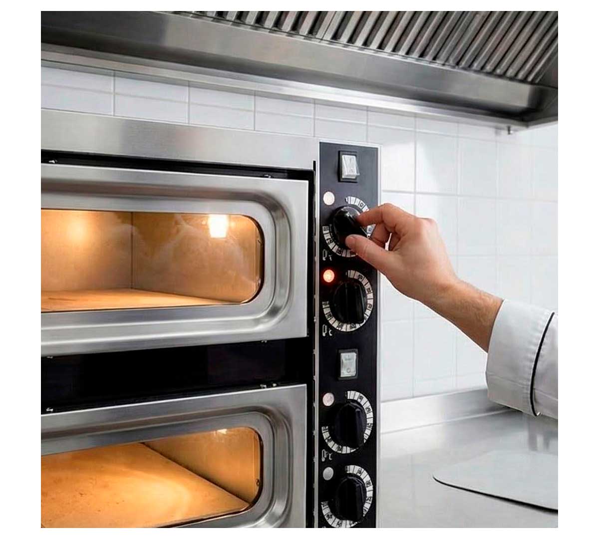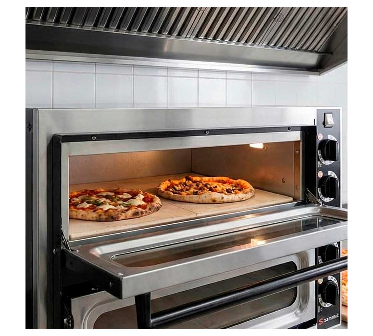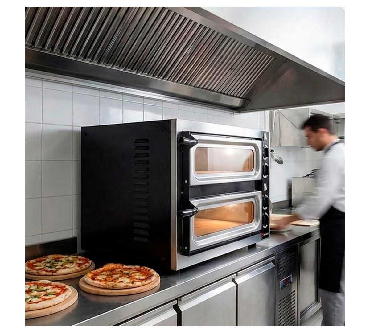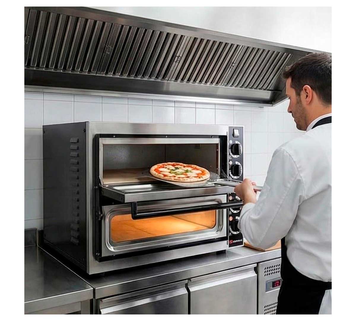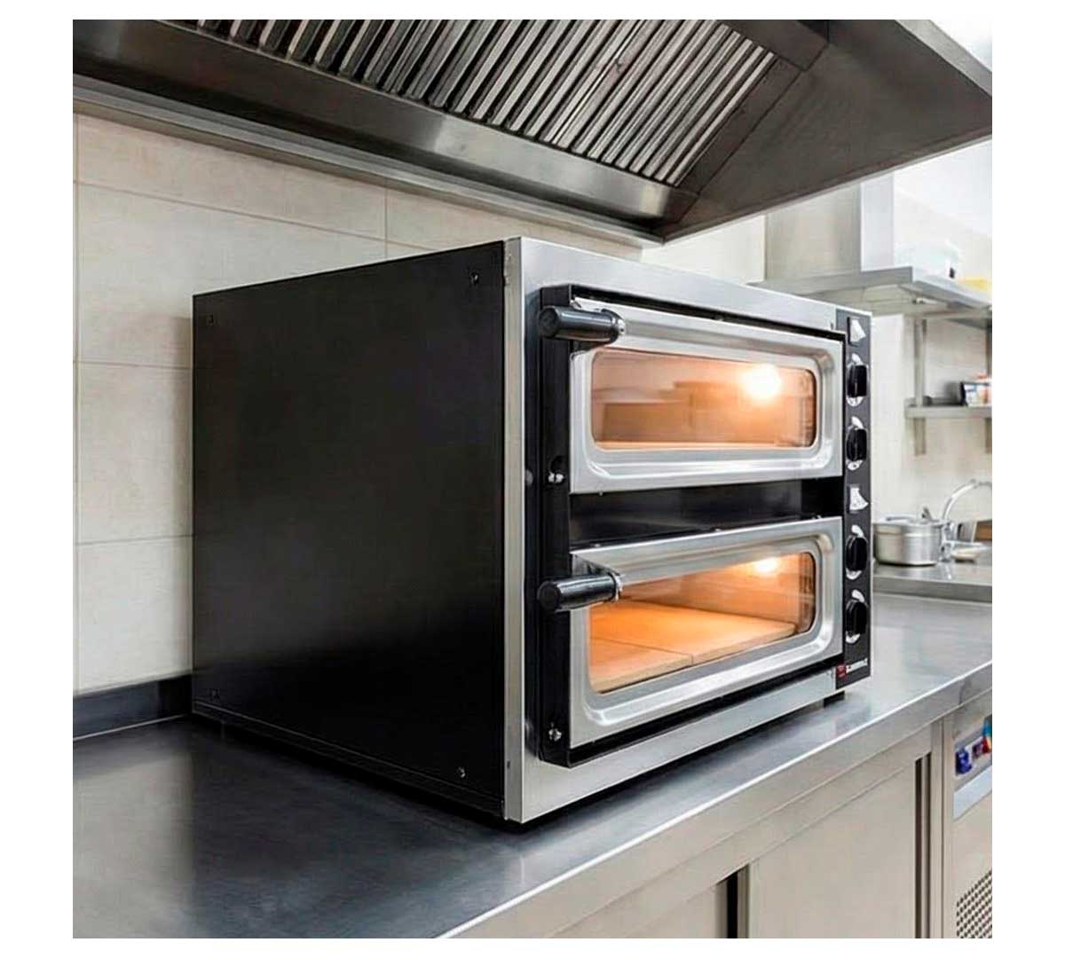 Horno eléctrico con dos cámaras de cocción con base de piedra refractaria. Tiene un diseño compacto ideal para cocinar todo tipo de pizzas, sin ocupar demasiado espacio en la cocina. Tiene termostato superior e inferior en cada cámara. Permite un rango de temperatura de 50 a 320 ºC.