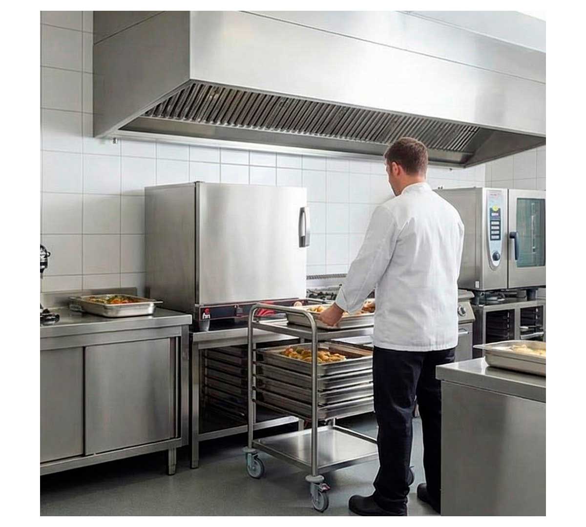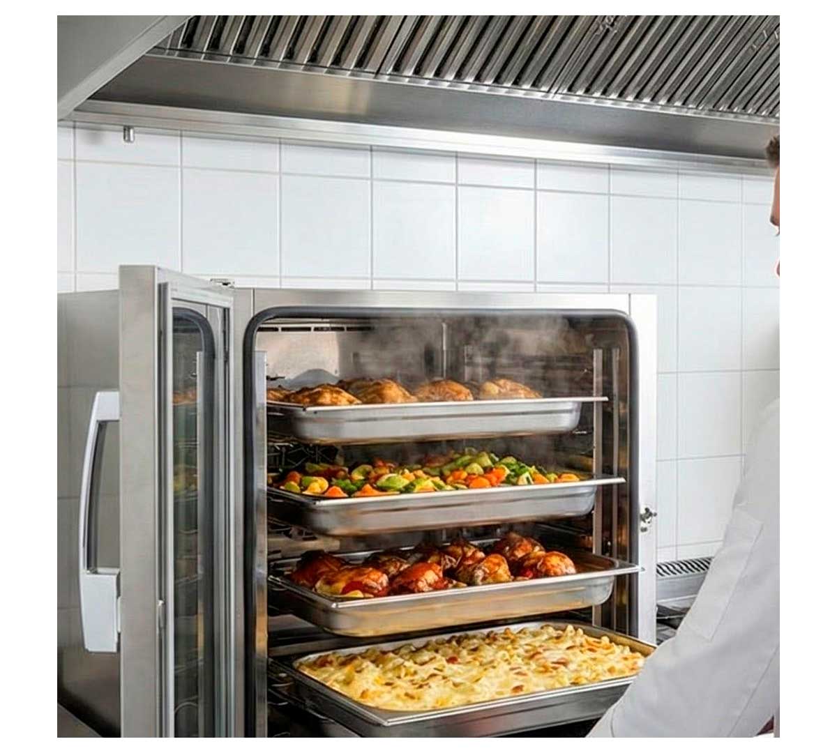 Horno con tiempo de cocción programable, alarma fin de ciclo, micro de puerta. Temperatura máxima 140 / 160 ºC y distancia entre bandejas 65 mm.
