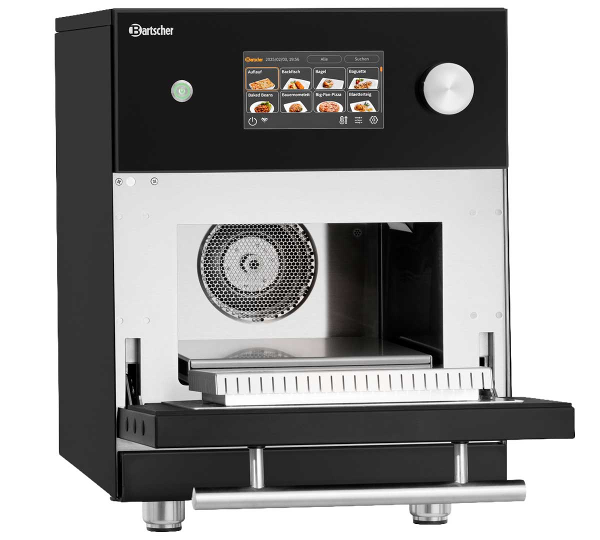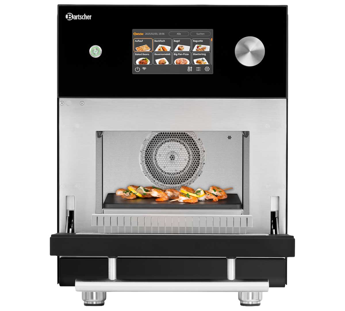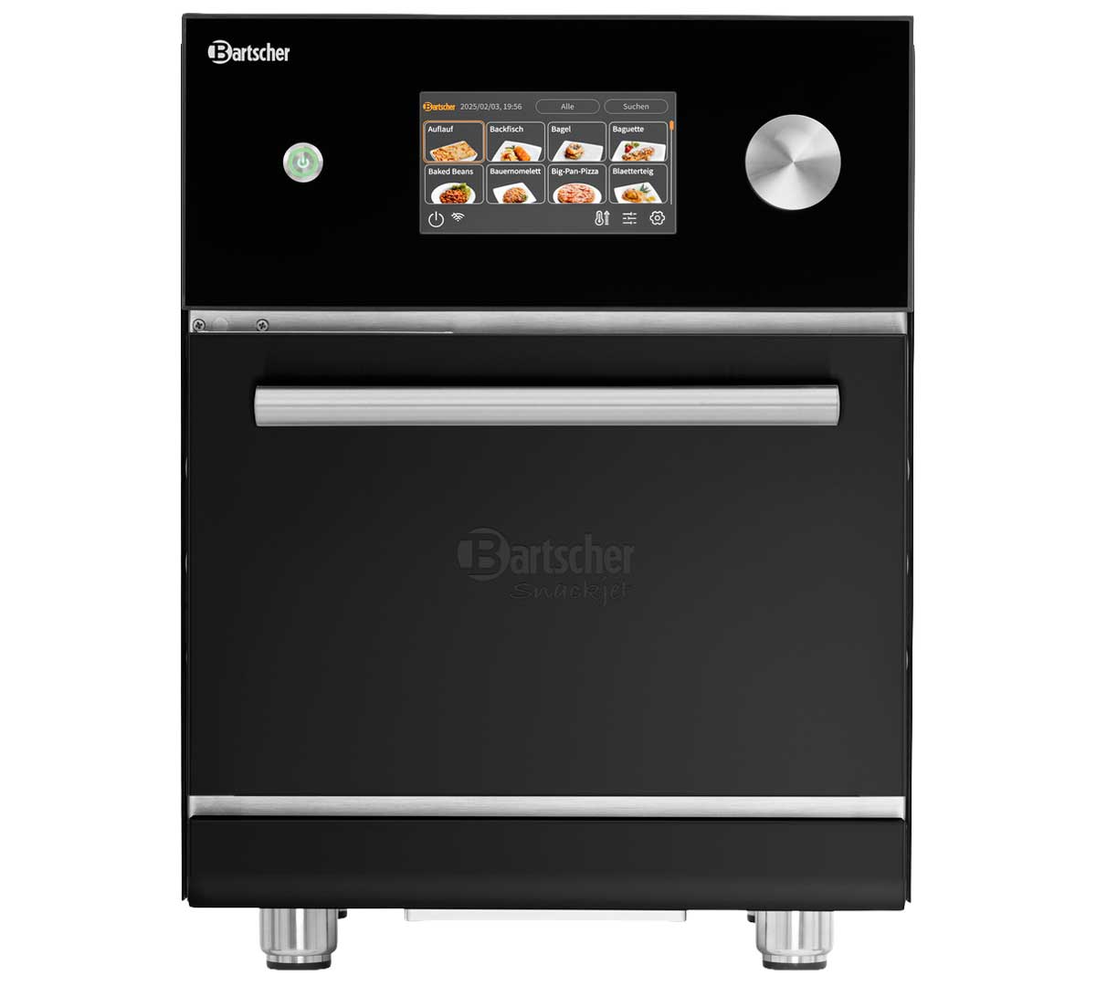 El Snackjet 500, disponible en versión inox y negra pertenece a la gama premium de hornos de alta velocidad Bartscher con 1.000 programas y combinación de 1500 W microondas + 3000 W aire caliente + grill, orientado a uso intensivo profesional.