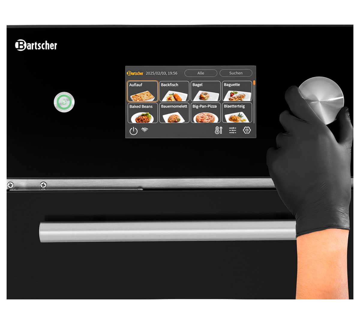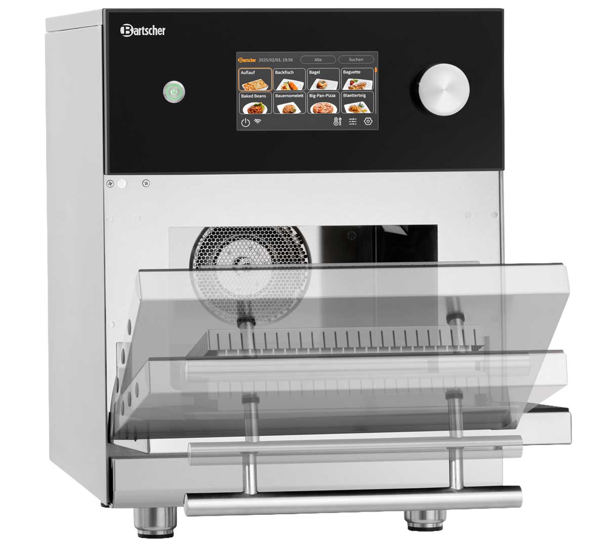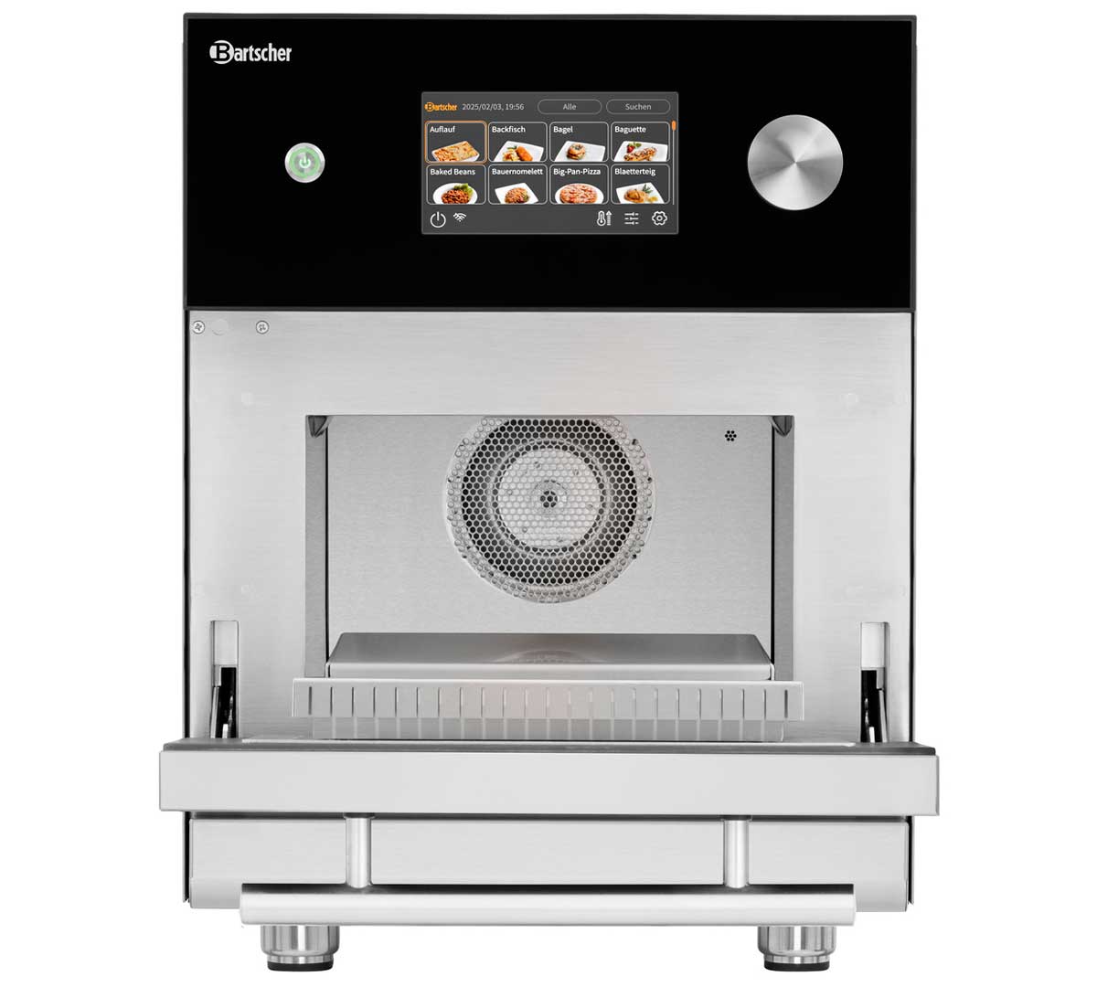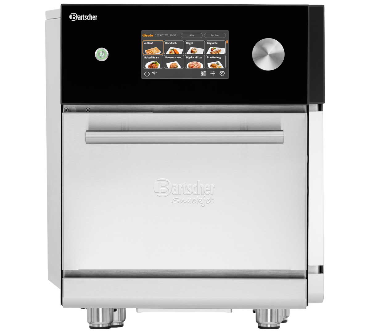 El Snackjet 500, disponible en versión inox y negra pertenece a la gama premium de hornos de alta velocidad Bartscher con 1.000 programas y combinación de 1500 W microondas + 3000 W aire caliente + grill, orientado a uso intensivo profesional.