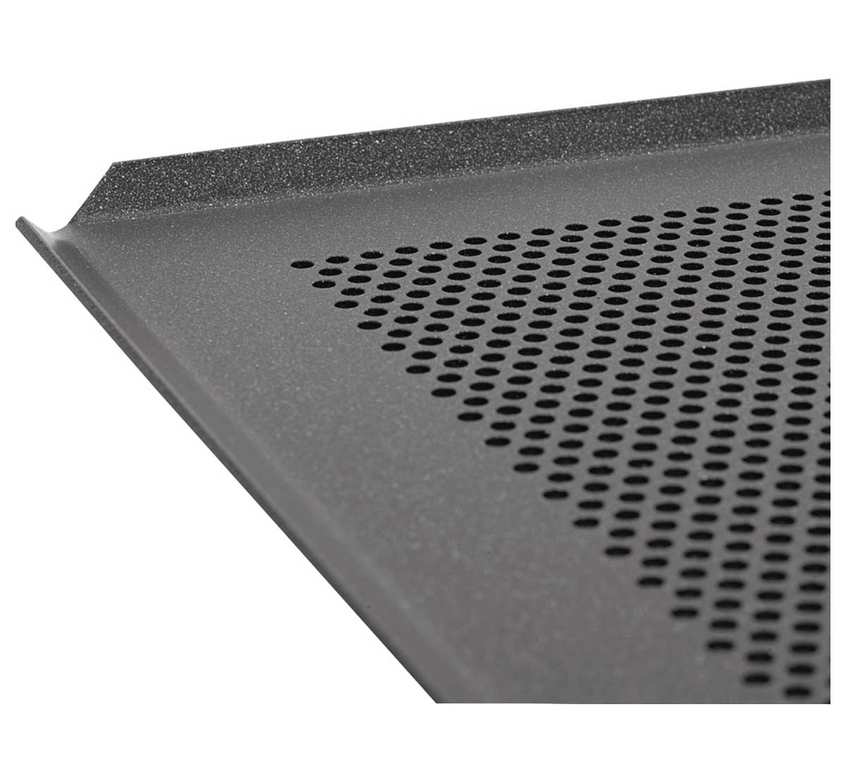 Este tipo de bandeja perforada, también conocida como bandeja de panadería o chapa de horneado, destaca por su excelente transmisión del calor y su capacidad para favorecer una cocción uniforme gracias a la distribución regular de los agujeros.