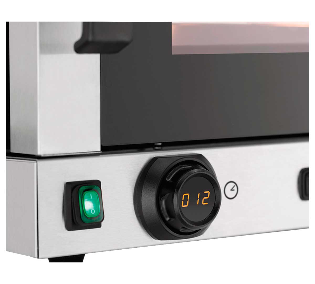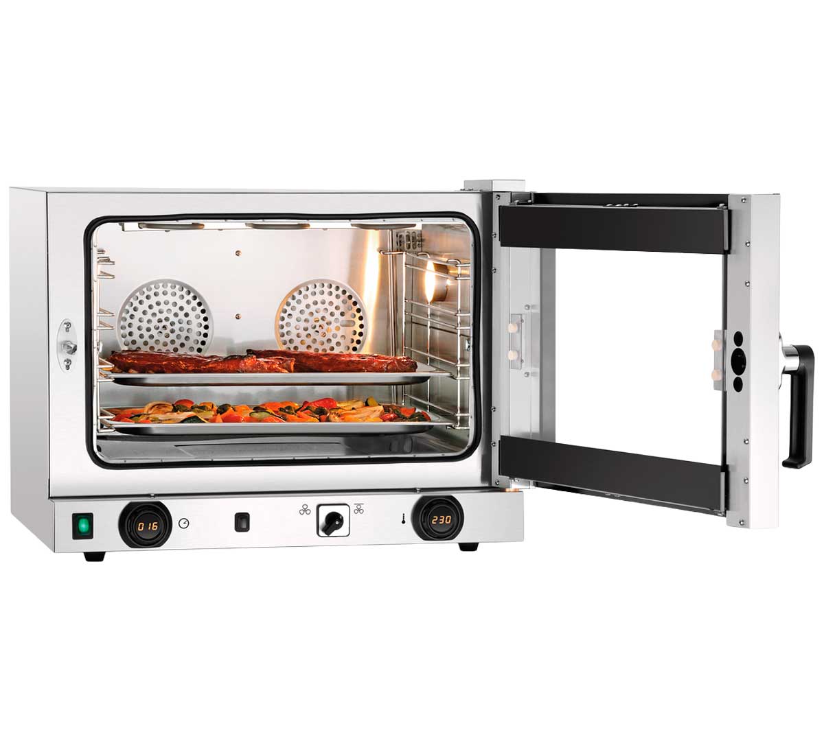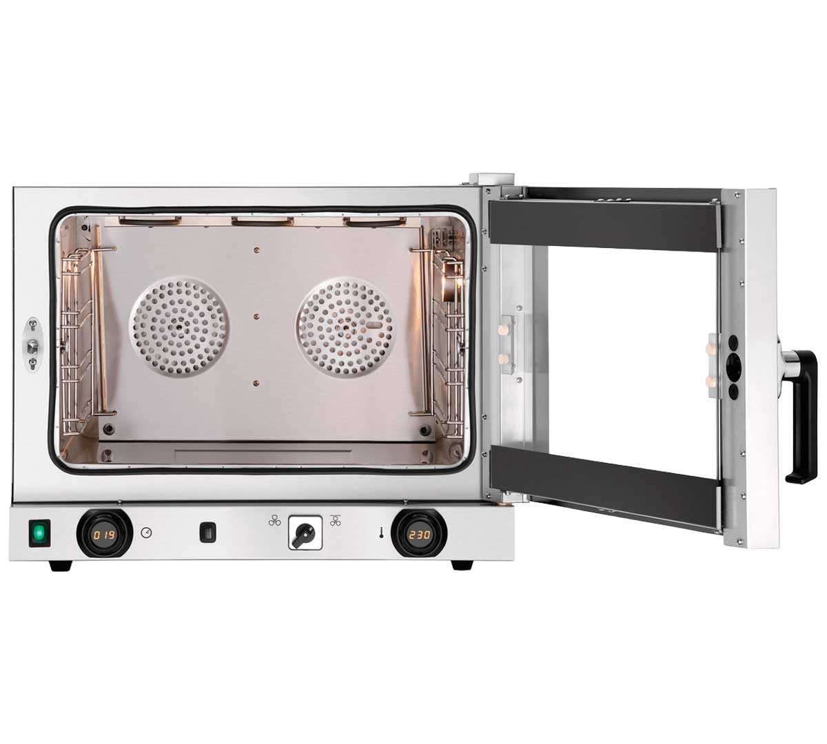 Horno de convección con función grill y humidificación. Tiene control digital sencillo. Con capacidad para 4 bandejas GN 1/1. Puede alcanzar rango de temperatura de 50 a 300 °C. Cámara en acero inoxidable.