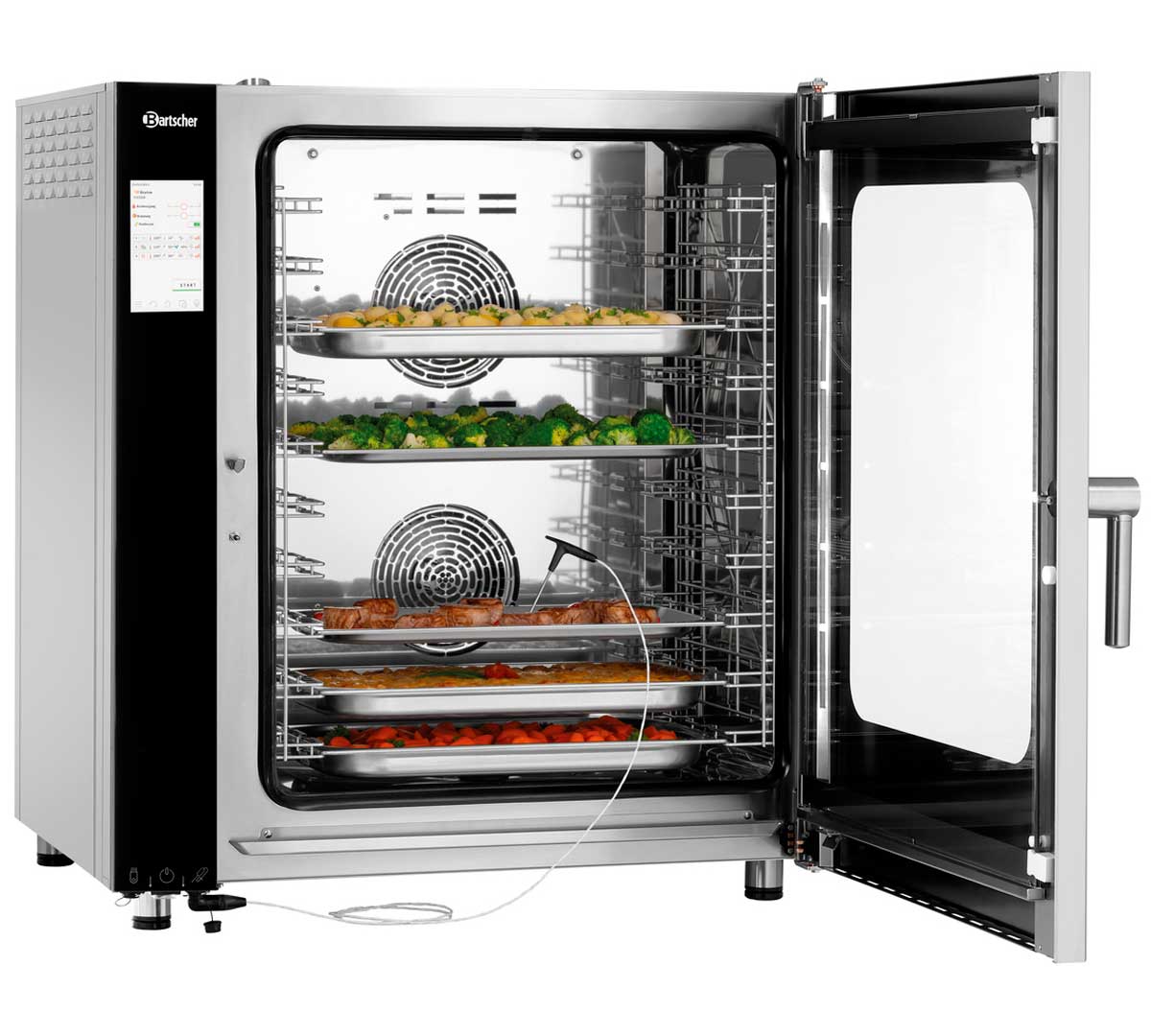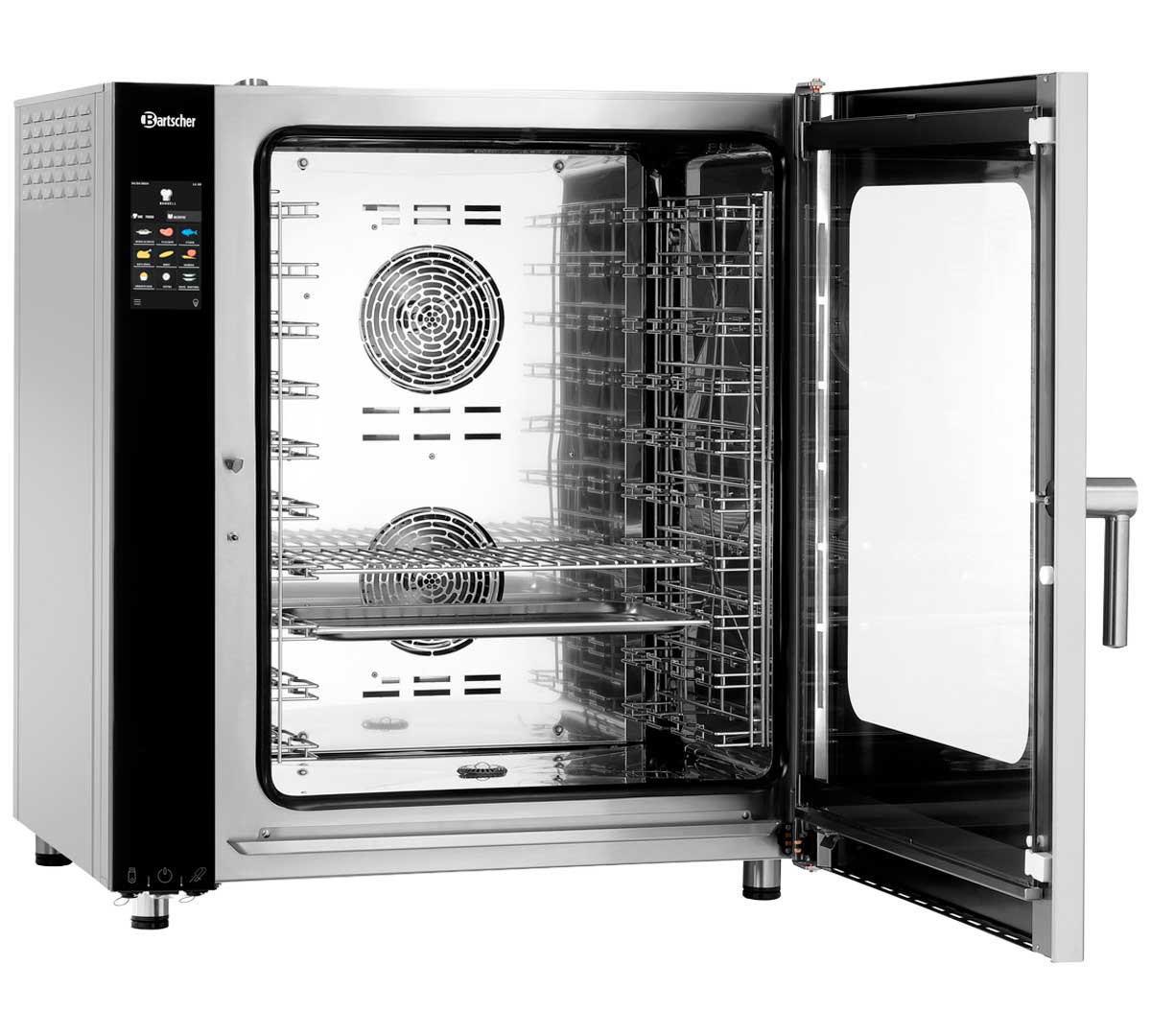 El Horno Silversteam2 10110D pertenece a la serie Silversteam2 de Bartscher y ofrece 10 niveles GN 1/1 con control táctil avanzado, funciones profesionales como Rack Control y cocción Delta T, orientado a cocinas de alto rendimiento continuo.