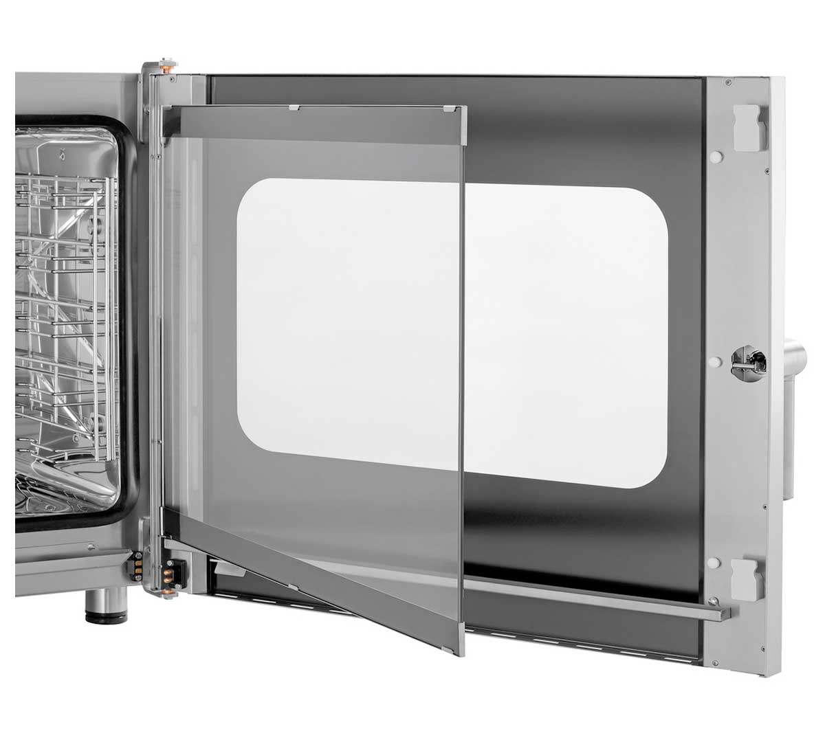 El horno mixto Silversteam2 10110M tiene un orificio de drenaje dentro de la cámara para eliminar el agua condensada durante la cocción. Este drenaje se conecta a un desagüe externo para evitar acumulaciones y mantener la cámara seca.