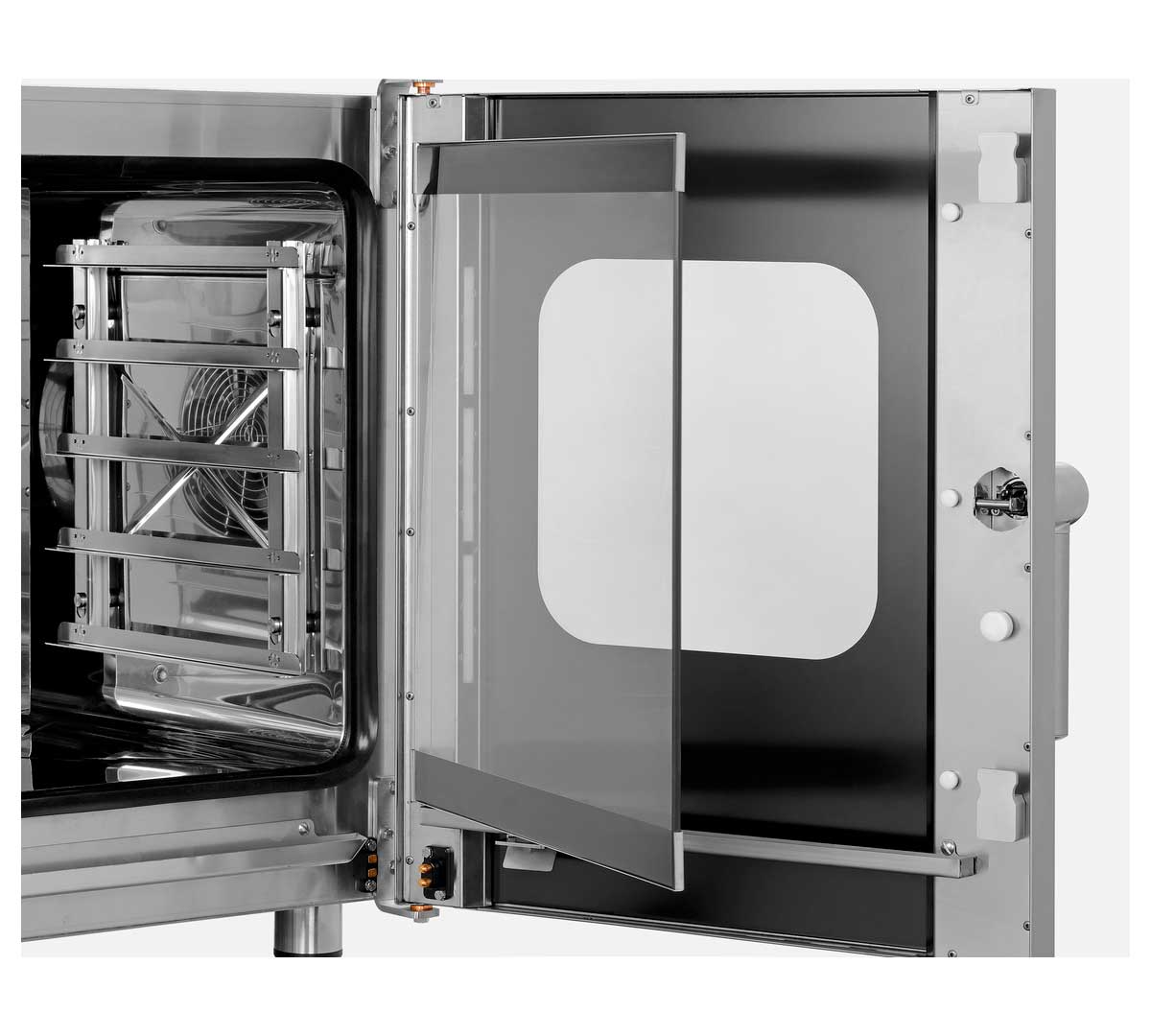 Horno mixto eléctrico profesional con control digital. Funciona mediante convección y vapor por inyección directa. Tiene capacidad para 5 bandejas 2/3 GN y temperatura hasta 300 °C. Diseñado para cocinas profesionales que buscan precisión, programación avanzada y máximo control en formato compacto.