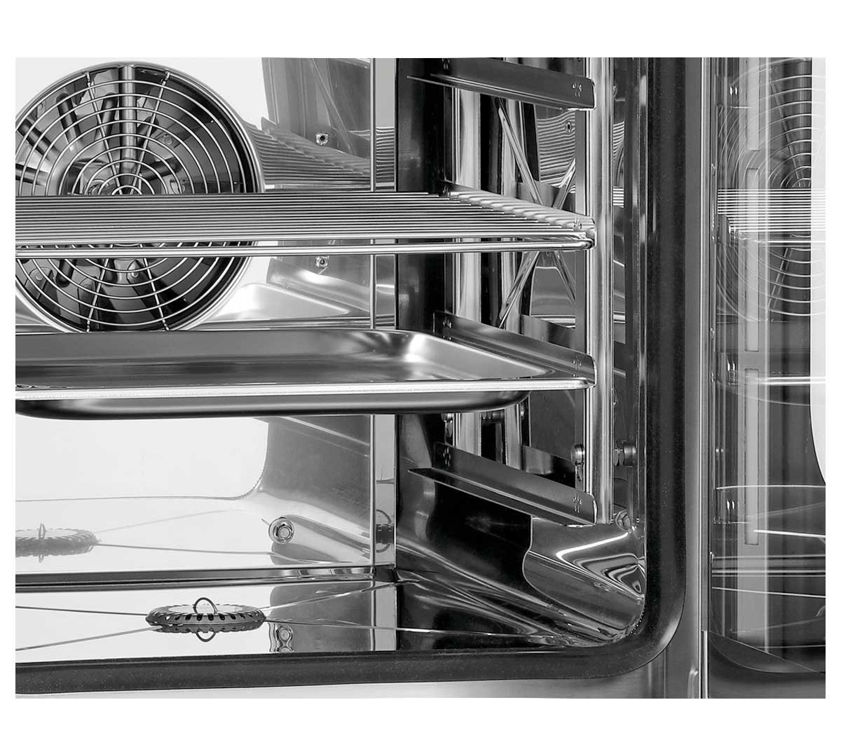 El horno incluye rieles para 5 bandejas en formato 2/3 GN con una separación de 74 mm entre ranuras. Se suministra con una rejilla y una bandeja 2/3 GN, siendo compatible con recipientes gastronorm según los estándares establecidos.