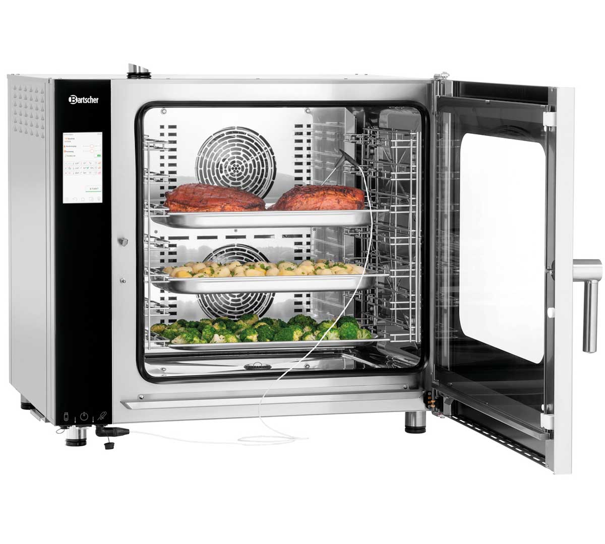 Este horno de 7 pares de guías GN 1/1 pertenece a la serie Silversteam2 D de Bartscher, es un horno combinado eléctrico con potencia reforzada, Rack Control y control táctil avanzado, pensado para cámaras de cocción muy cargadas. El sistema de limpieza es manual.