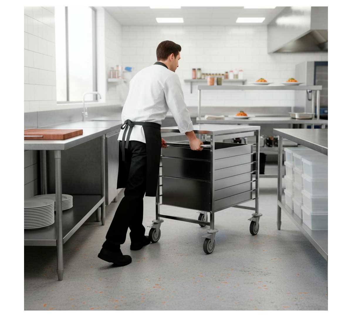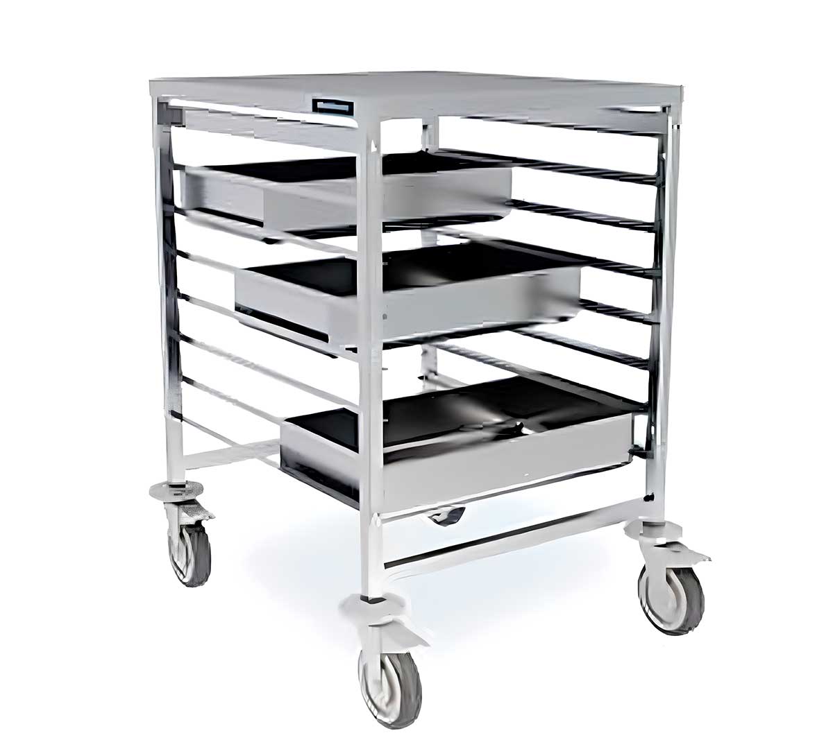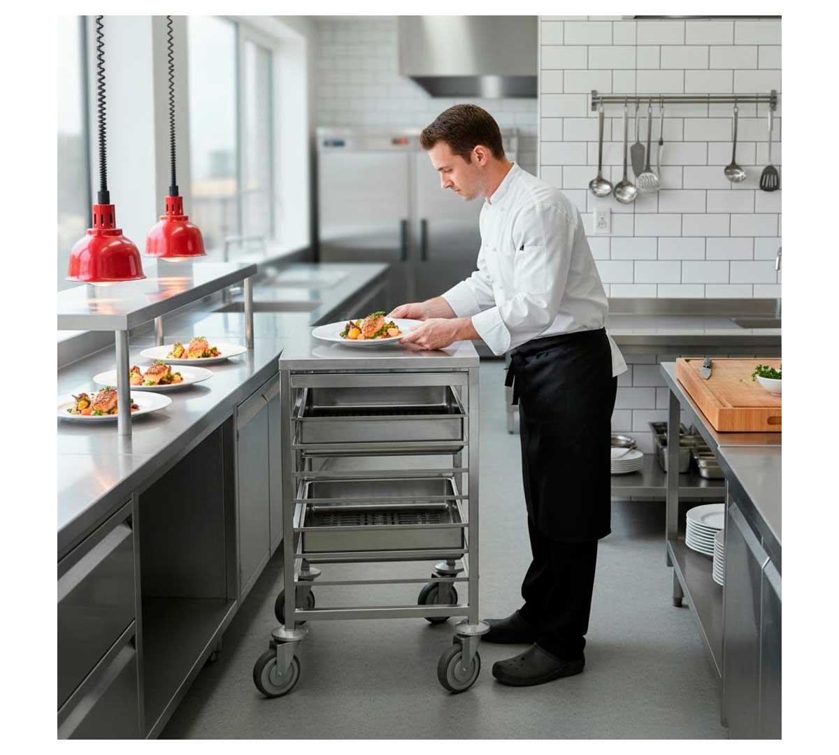 Carro porta bandejas bajo con capacidad para 7 bandejas GN 1/1 o 7 bandejas GN 2/1, según el modelo. La separación entre niveles es de 7,5 cm. Incluye 4 ruedas con parachoques. Las cubetas gastronorm no están incluidas.