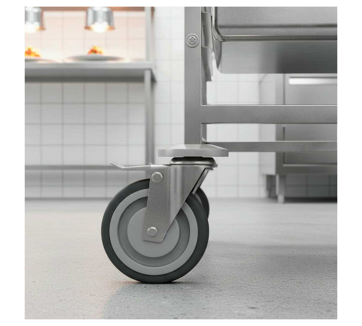 El Carro Bajo Reforzado GN de Distform está fabricado en acero inoxidable AISI 304 18/10. Este material se caracteriza por su durabilidad y resistencia.