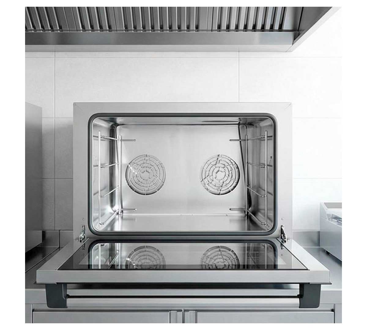 Horno de convección con capacidad para 4 bandejas de 48 x 34 cm o GN 1/1. Es ideal para hornear pan precocido y bollería. Alcanza una temperatura máxima de 250 ºC y tiene una potencia de 3,8 kW.