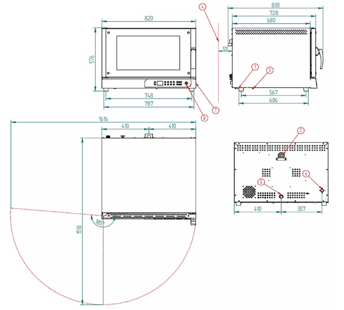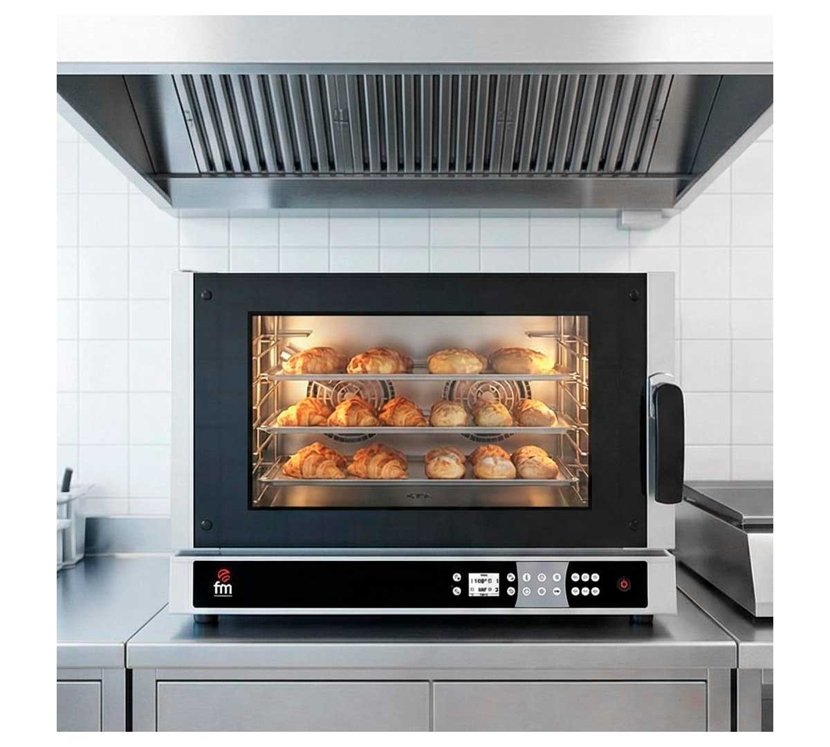 Horno de convección con capacidad para 4 bandejas, ideal para cocciones uniformes. Potente, con control de clima y temporizador, alcanza hasta 260 °C. Conexión trifásica y diseño robusto.