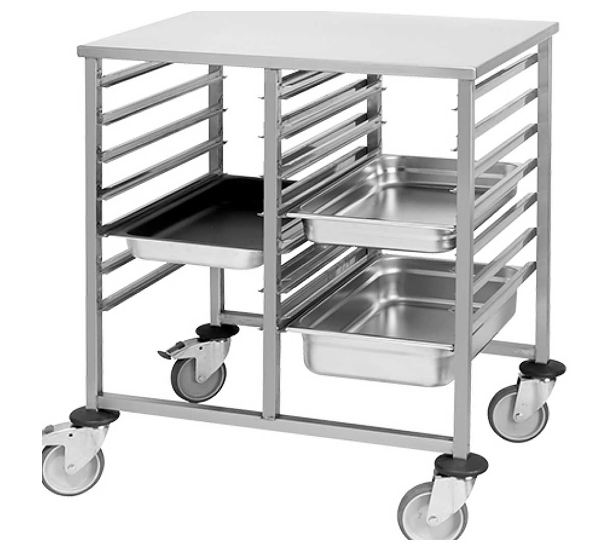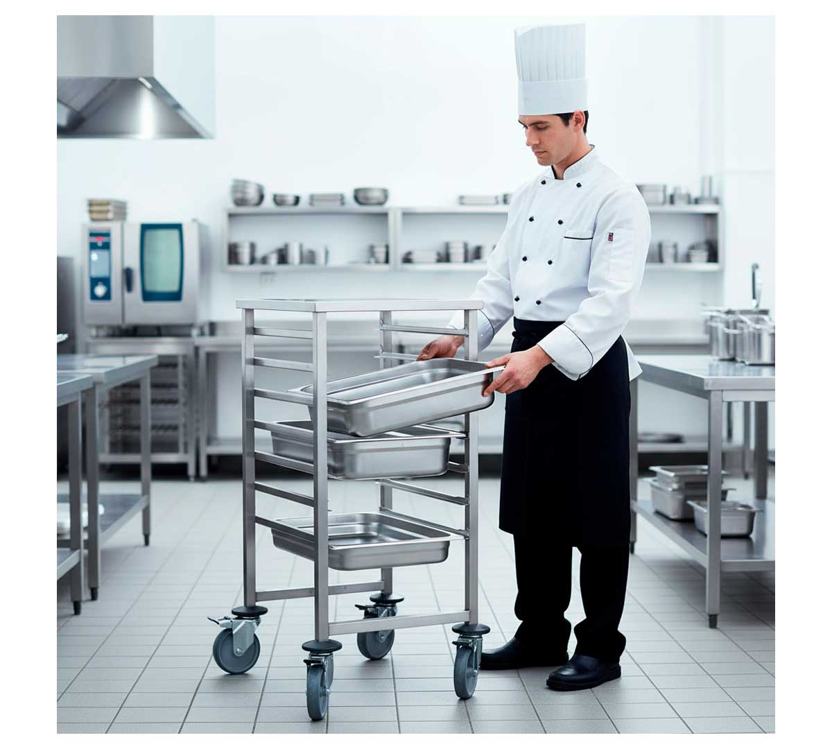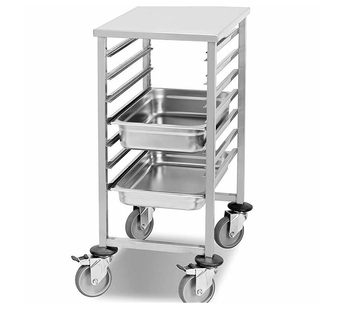 Carro porta bandejas capacidad para bandejas GN 1/1 o GN 2/1, según el modelo. Los niveles tienen una separación de 7,5 cm. Fabricado en acero inoxidable. Las cubetas gastronorm no están incluidas.