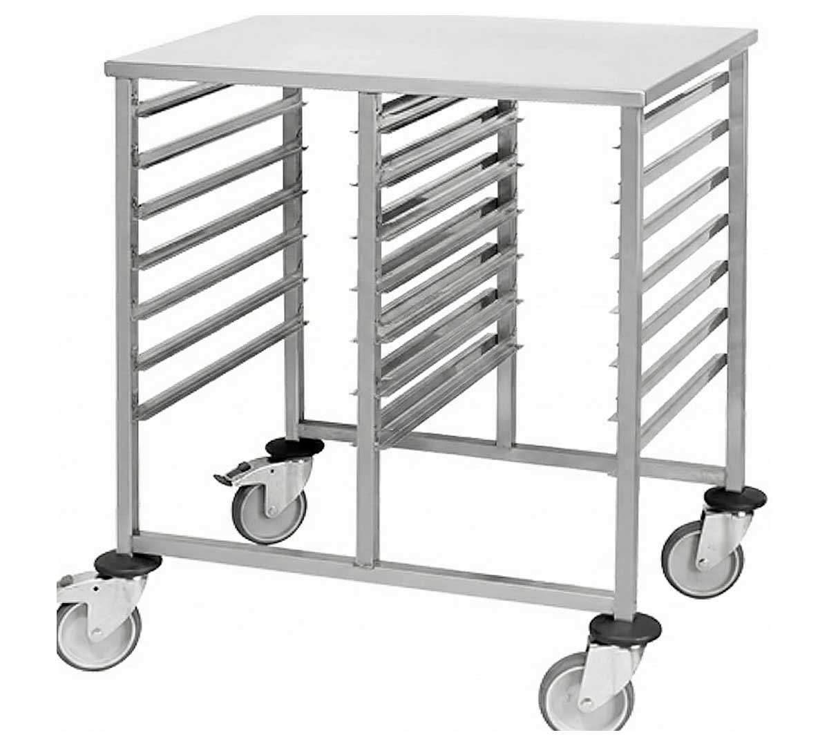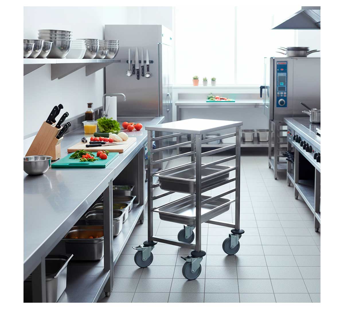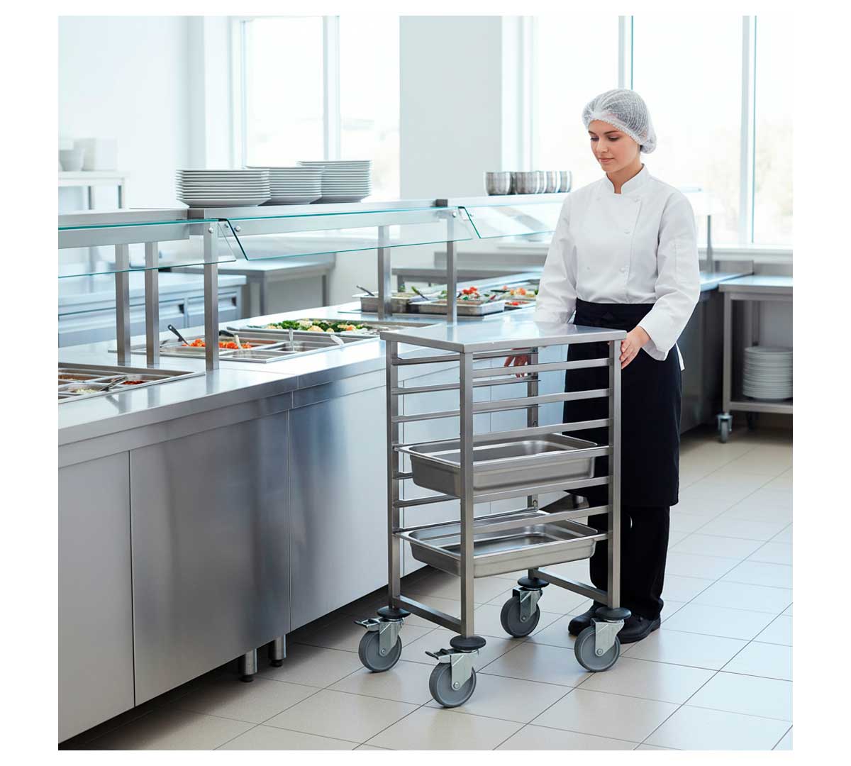 Carro porta bandejas capacidad para bandejas GN 1/1 o GN 2/1, según el modelo. Los niveles tienen una separación de 7,5 cm. Fabricado en acero inoxidable. Las cubetas gastronorm no están incluidas.
