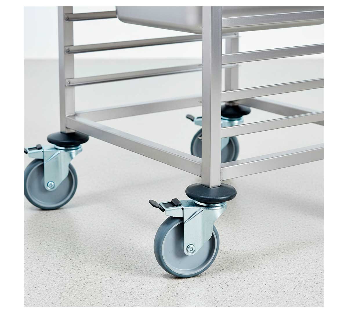 Este carro porta bandejas está disponible con ruedas poliamida con un coste extra. Consúltanos para más información.