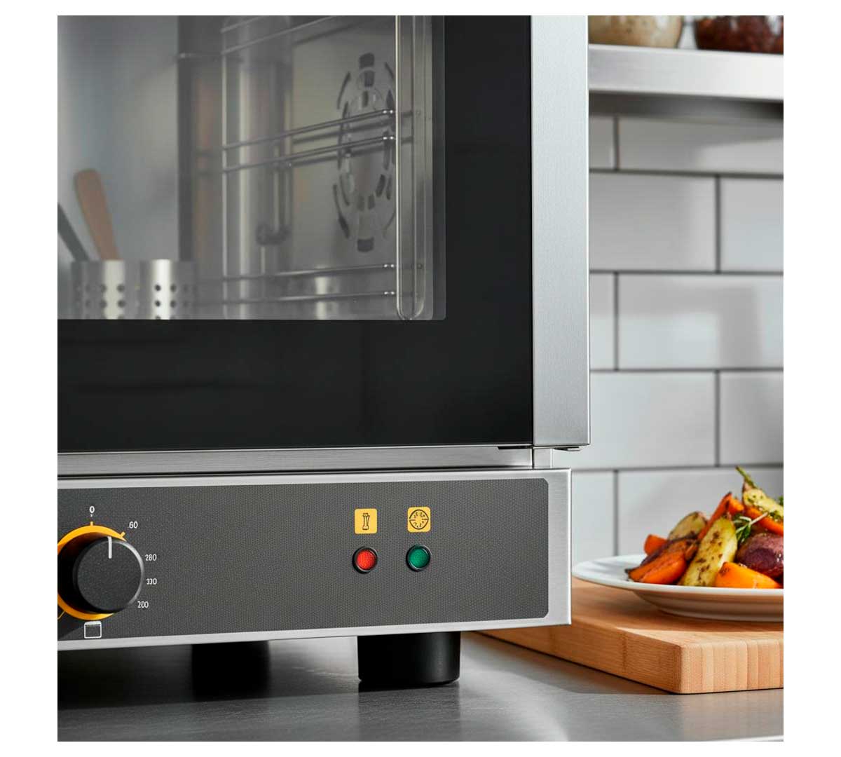 Horno eléctrico de convección fabricado en Italia por Tecnoeka. Equipado con panel de control electromecánico. Tiene capacidad para 4 bandejas tamaño 42,9 x 34,5 cm. La distancia entre las rejillas es de de 74 mm. Tiene una potencia de 2,8 kW. Está preparado para una conexión monofásica.
