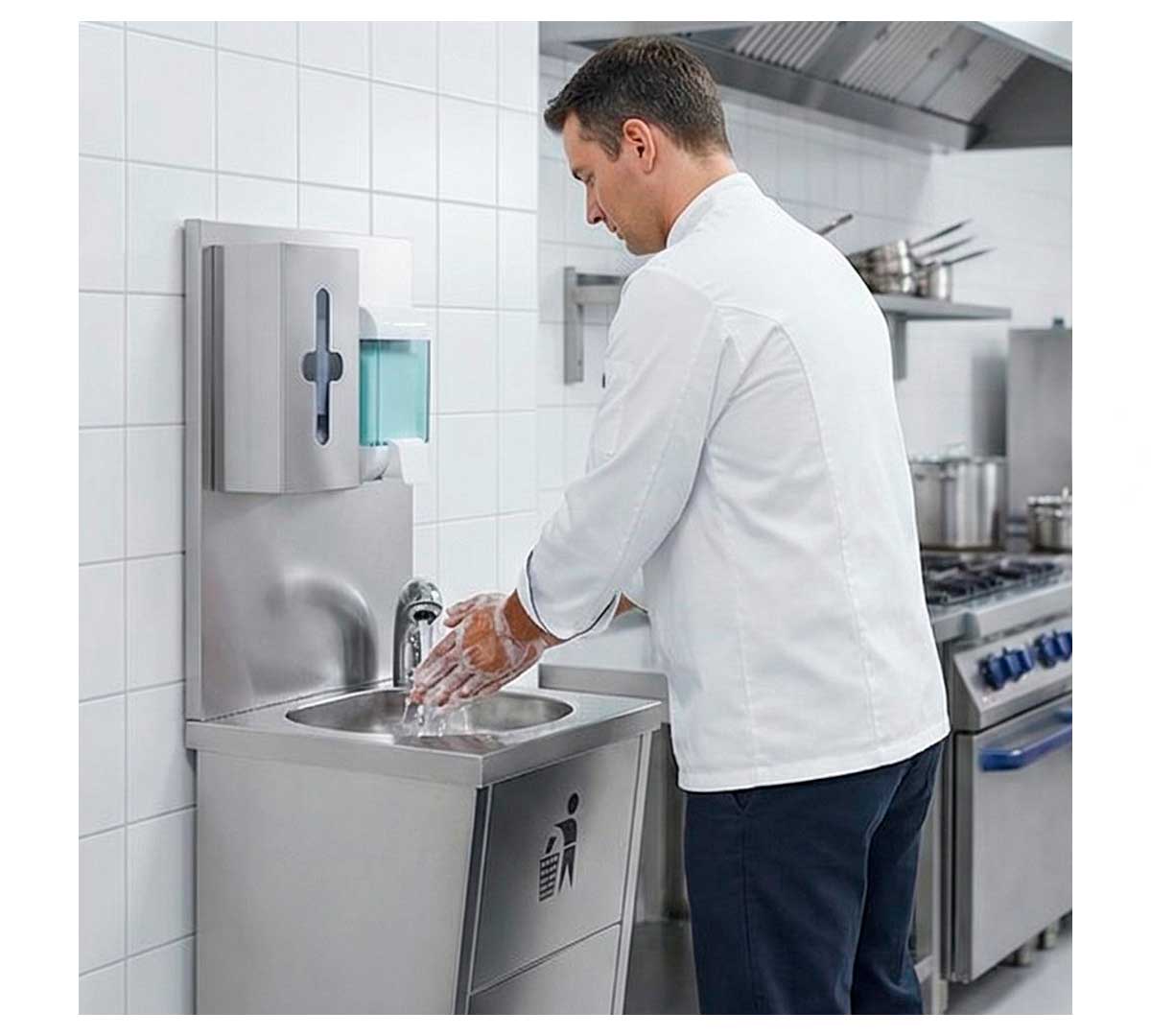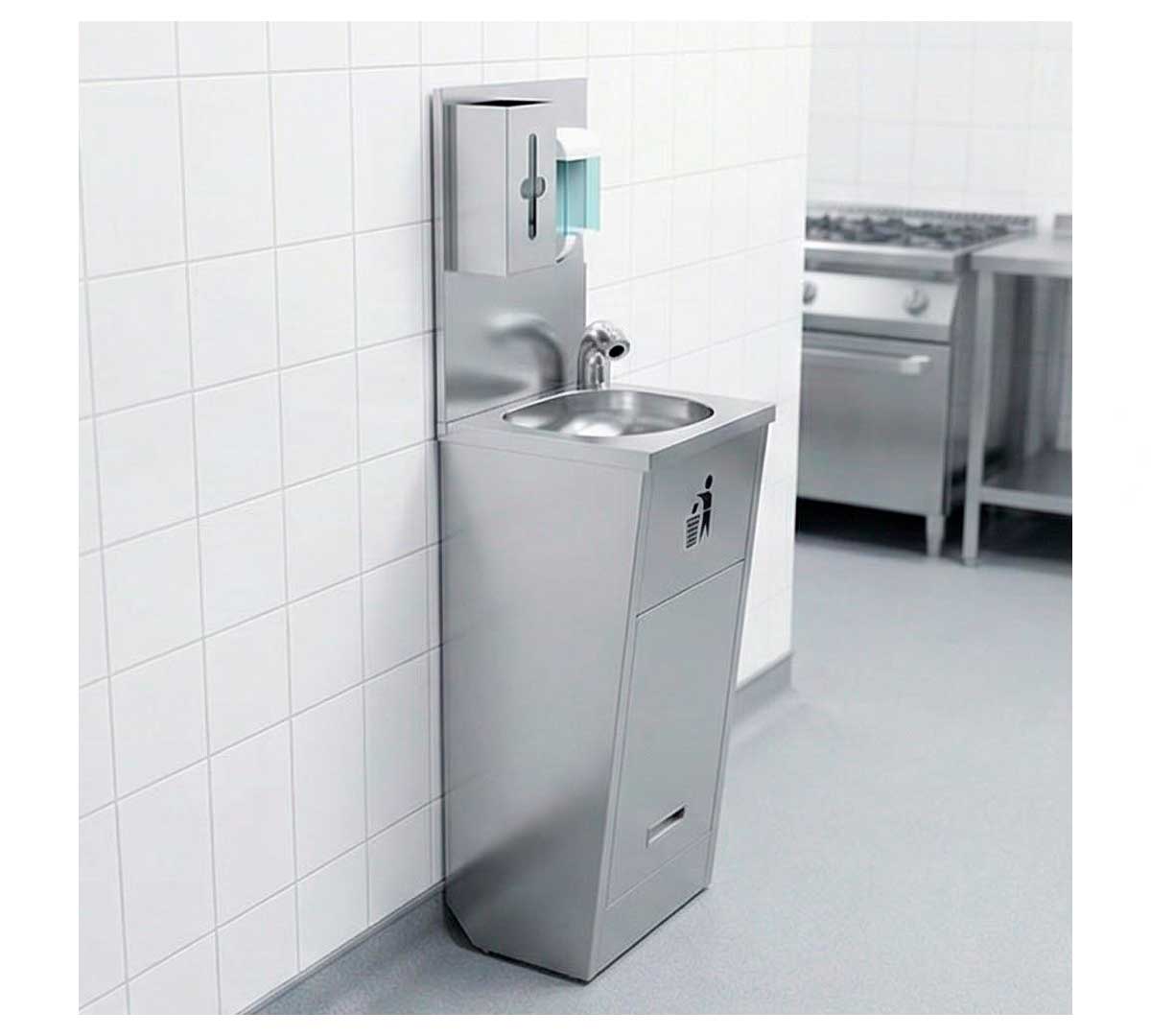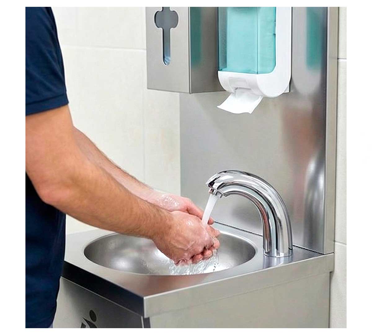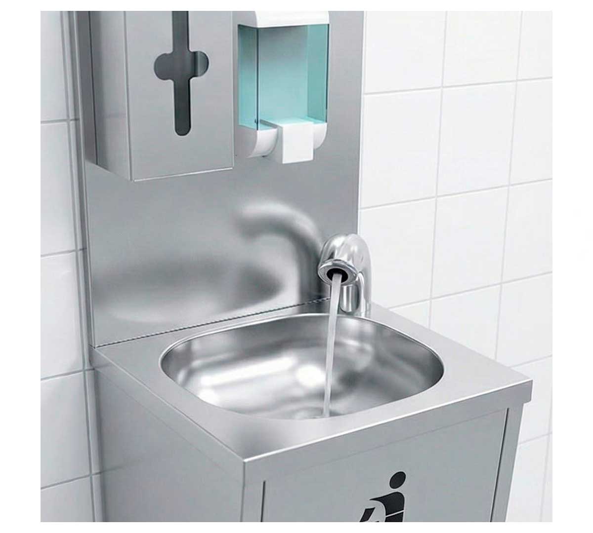 Lavamanos completo serie 44 con accionamiento electrónico, sin contacto. Está equipado con papelera y dispensadores de jabón y toallitas. Incorpora mezclador anti-retorno de agua fría y caliente. Se suministra con los accesorios para su instalación.